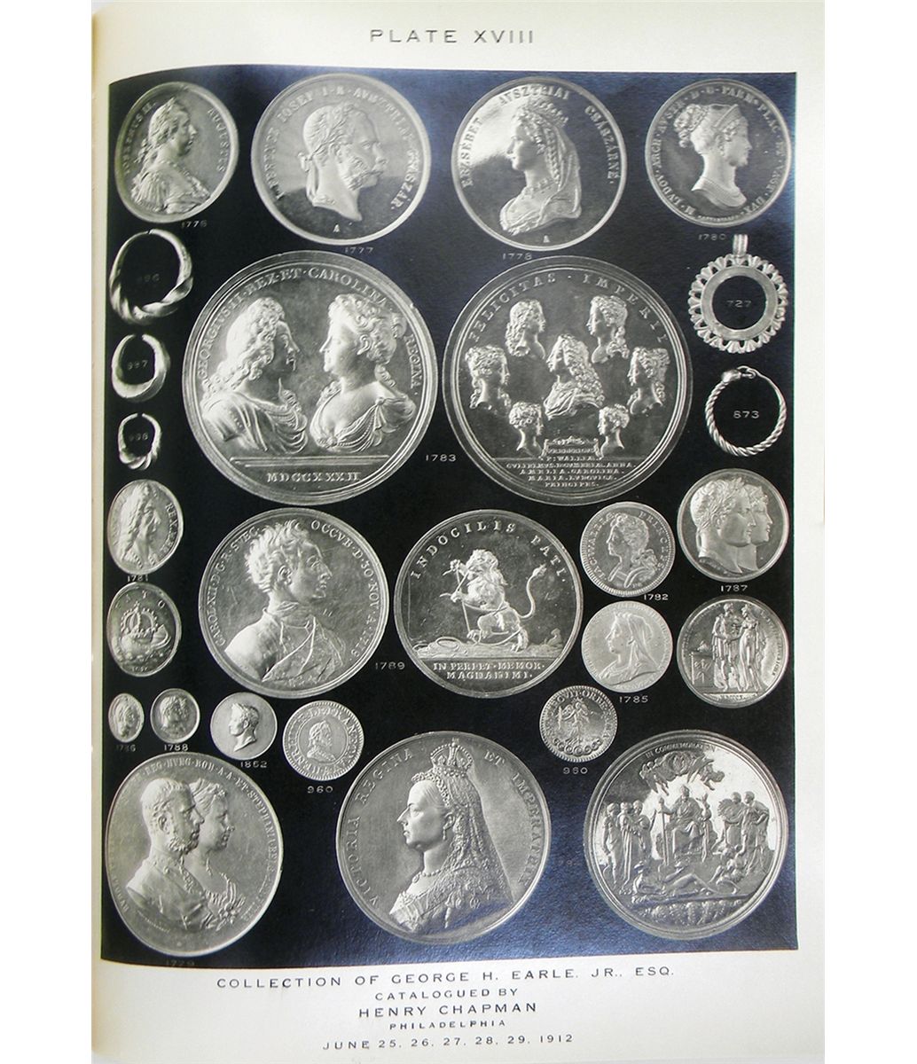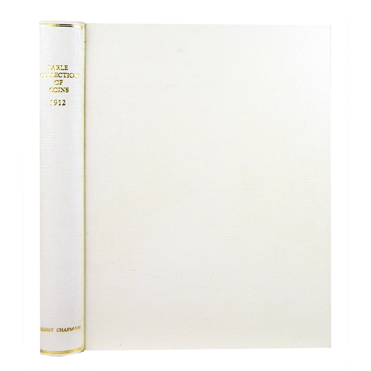 Chapman, Henry. CATALOGUE OF THE MAGNIFICENT COLLECTION OF ANCIENT GREEK AND ROMAN, EUROPEAN, ORIENTAL, EARLY AMERICAN AND UNITED STATES COINS OF GEORGE H. EARLE, JR., ESQ., PHILADELPHIA. Philadelphia: Messrs. Davis & Harvey, Auctioneers, June 25-29, 1912. 4to, later white leatherette, gilt; original gilt-printed front paper cover bound in. v, (3), 225, (3) pages; 3875 lots; 39 very fine photographic plates. Hand-priced in black ink. Contemporary newspaper report of the sale affixed to front flyleaf. First plate torn, with somewhat crude tape repair. Otherwise, near fine. Adams A+: "One of the great collections: balanced strength in ancients, European and U.S. rarities and high condition." The Earle sale realized $55,821.63, a record at the time. While not as extensive as the Jenks collection, coin for coin it is probably superior. The ancient, European and American sections are particularly remarkable, for rarity and condition alike. In the preface, Chapman termed it "the finest collection ever offered in this country." Plates I-V depict classic ancient Greek coins of fine style; plates VI-IX illustrate choice Roman and Byzantine portrait coins; plates X-XVIII depict European rarities; plate XIX illustrates orders and decorations; plates XX-XXIV depict an astounding array of American colonial, state coins and Washingtonia; plate XXV illustrates a remarkable panoply of rare American patterns; plates XXVI-XXVIII depict superb United States gold coins; plates XXIX-XXXIII illustrate the superb series of American silver coins; plates XXXIV-XXXVII depict outstanding large cents; plate XXXVIII illustrates choice half cents; and, finally, plate XXXIX depicts slugs and other pioneer gold rarities. Ex Charles Davis's Sept. 23, 1993 sale, lot 21. Ex Kolbe & Fanning Sale 122, lot 960. Ex Michael Spurlock library.