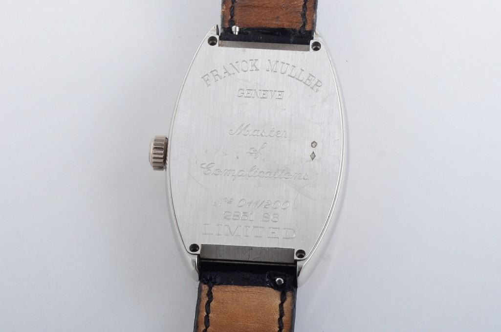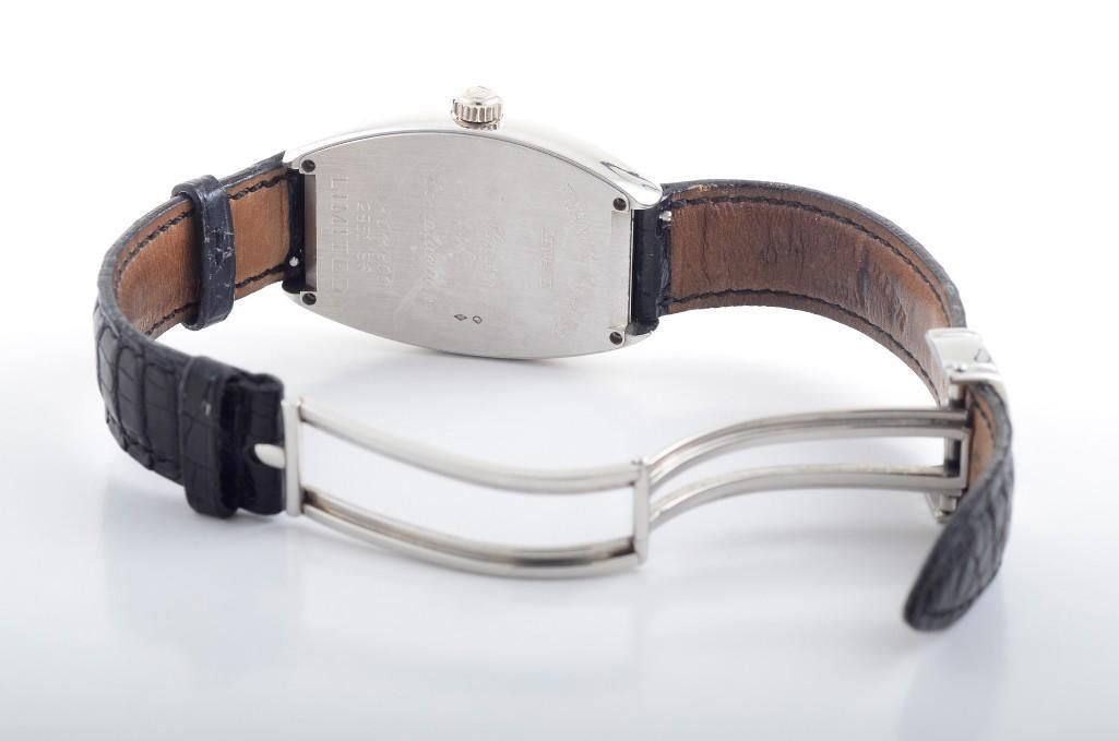 A rare limited edition Big Date Franck Muller platinum automatic watch 2851 S6. Number 11 of 200 limited edition pieces, hand engraved, featuring 21 jewels, lever escapement, monometallic balance. Black crocodile strap with steel deployment buckle. Total weight 99g