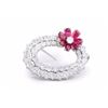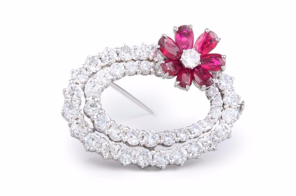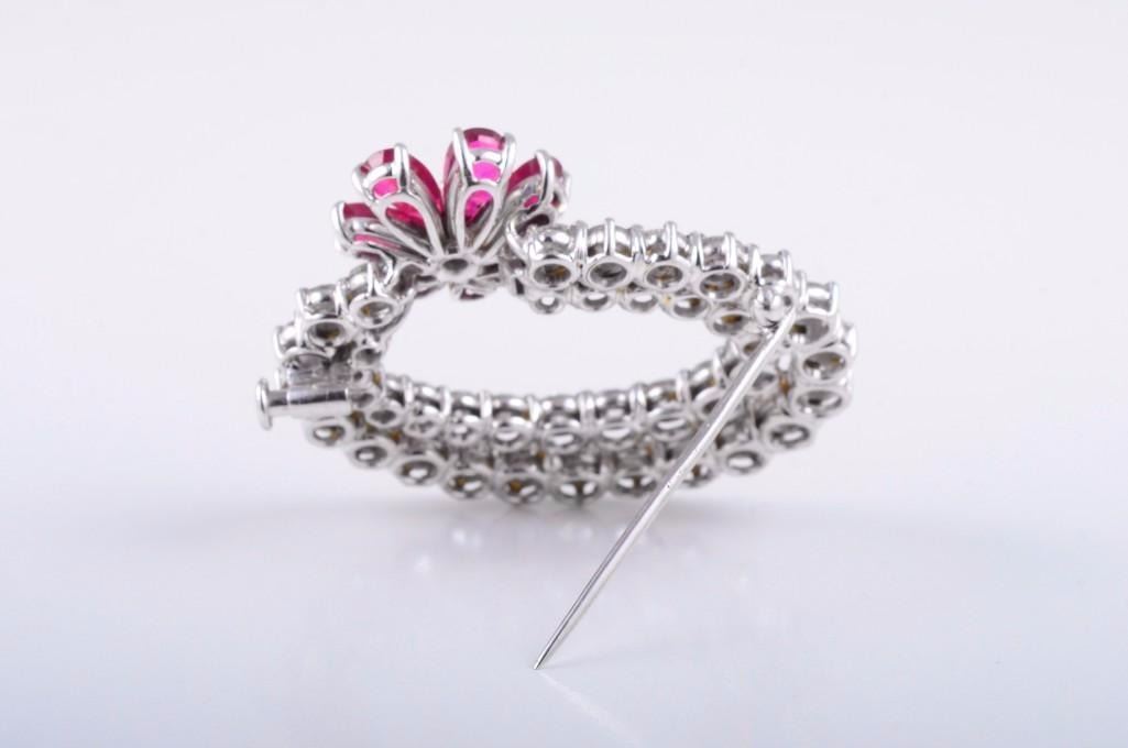 Platinum diamond and ruby brooch. 41 round diamonds weigh approximately 4.25 carat H-J color, VS to SI clarity. 7 pear shaped rubies weigh approximately 2.5 carat. Measures 1 3/8 inchesx1 1/8 inches, weight 10.3g. Accompanied by Milano CISGEM report no. 443, stating that rubies are from Burma with no heat treatment.