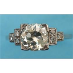 A Platinum and Diamond Ring, the large central diamond flanked by three smaller diamonds on stepped shoulders See colour illustration £1500 - 1800