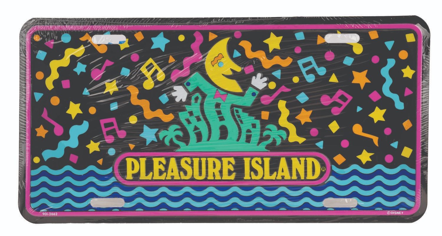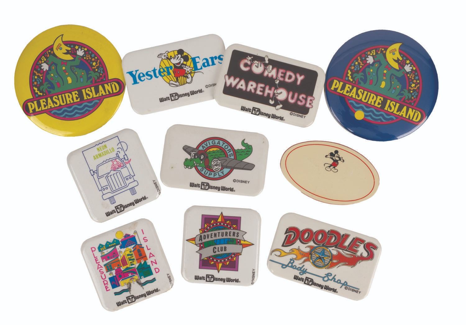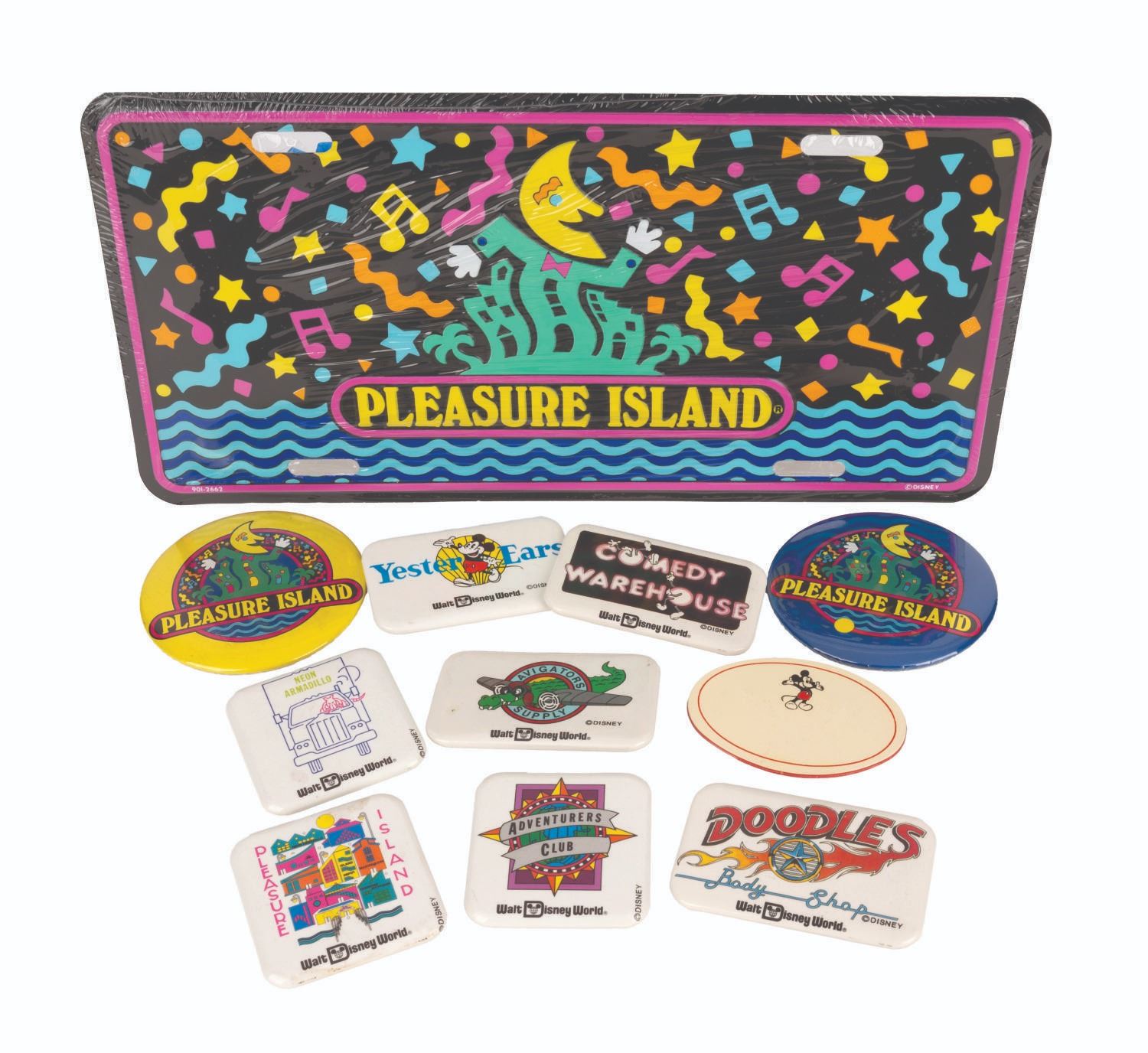 (Walt Disney World, 1989-2008) A collection of nine souvenir pinback buttons and a rare novelty "license" plate from Pleasure Island at Walt Disney World. Also included is a blank, unengraved 1970s Cast Member name tag. The buttons measure 2"x2" to 3" in diameter, the novelty plate is 12"x6", and the nametag is 2.75"x1.75". The buttons and name tag are in good-to-very good condition exhibiting minor scuffs and wear and the shrink wrapped novelty plate is in fine as-new condition.