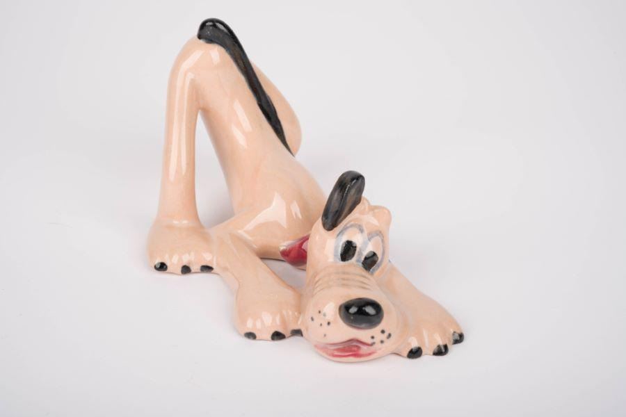 (Brayton Laguna, 1938) A ceramic figurine of Pluto by Brayton Laguna. The ceramics manufacturer was the first in California to have a licence to produce Disney character pieces. Measuring 3.5" x 6.5" and 3.25" tall, the figurine is in very good condition with light wear from age. This piece was frequently accompanied by a small ceramic worm figurine, which is not included with this figurine.