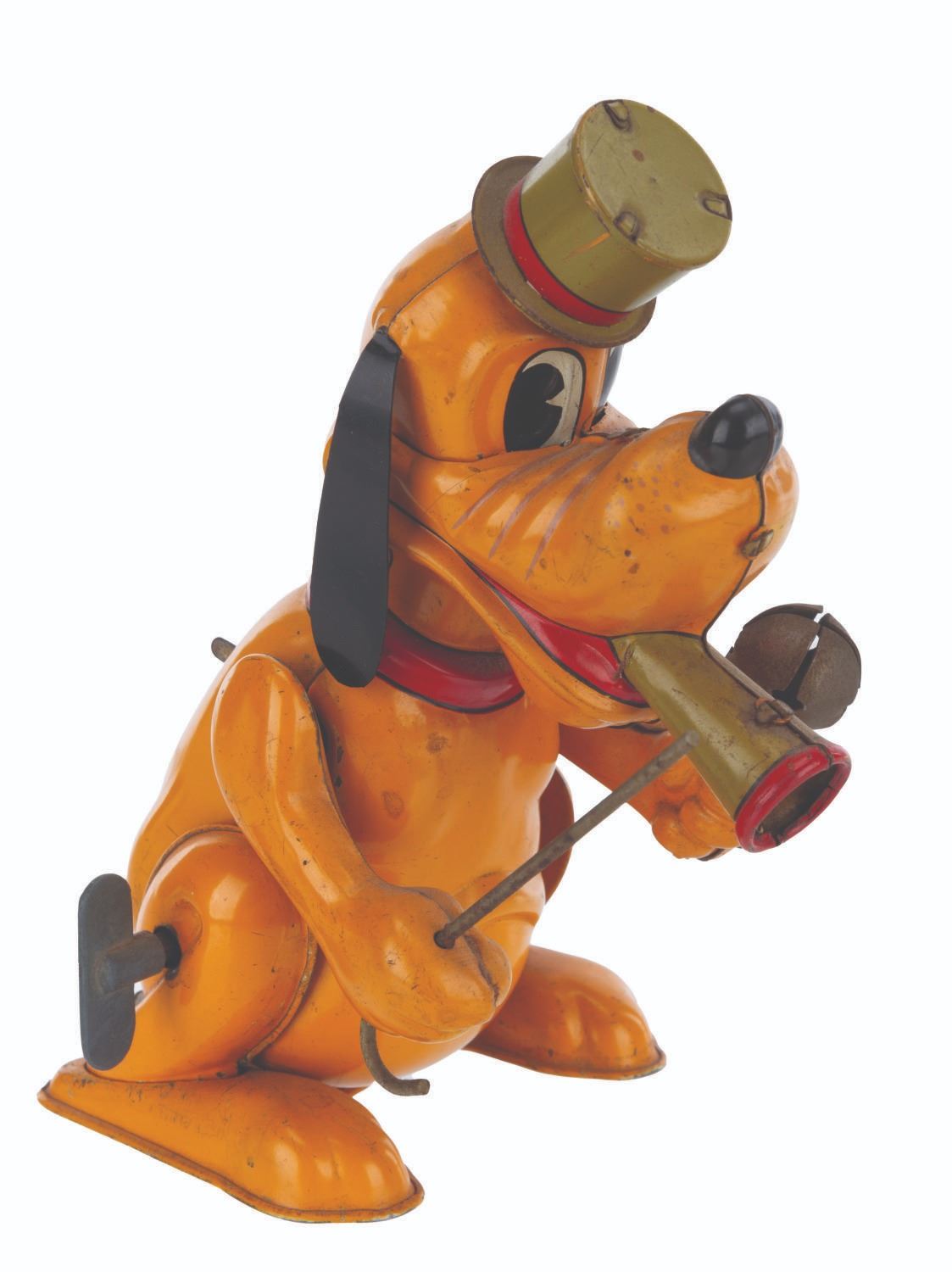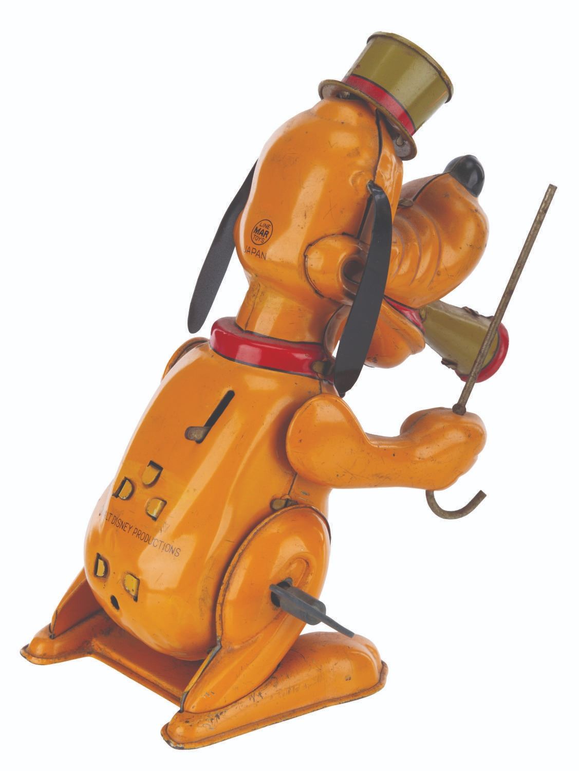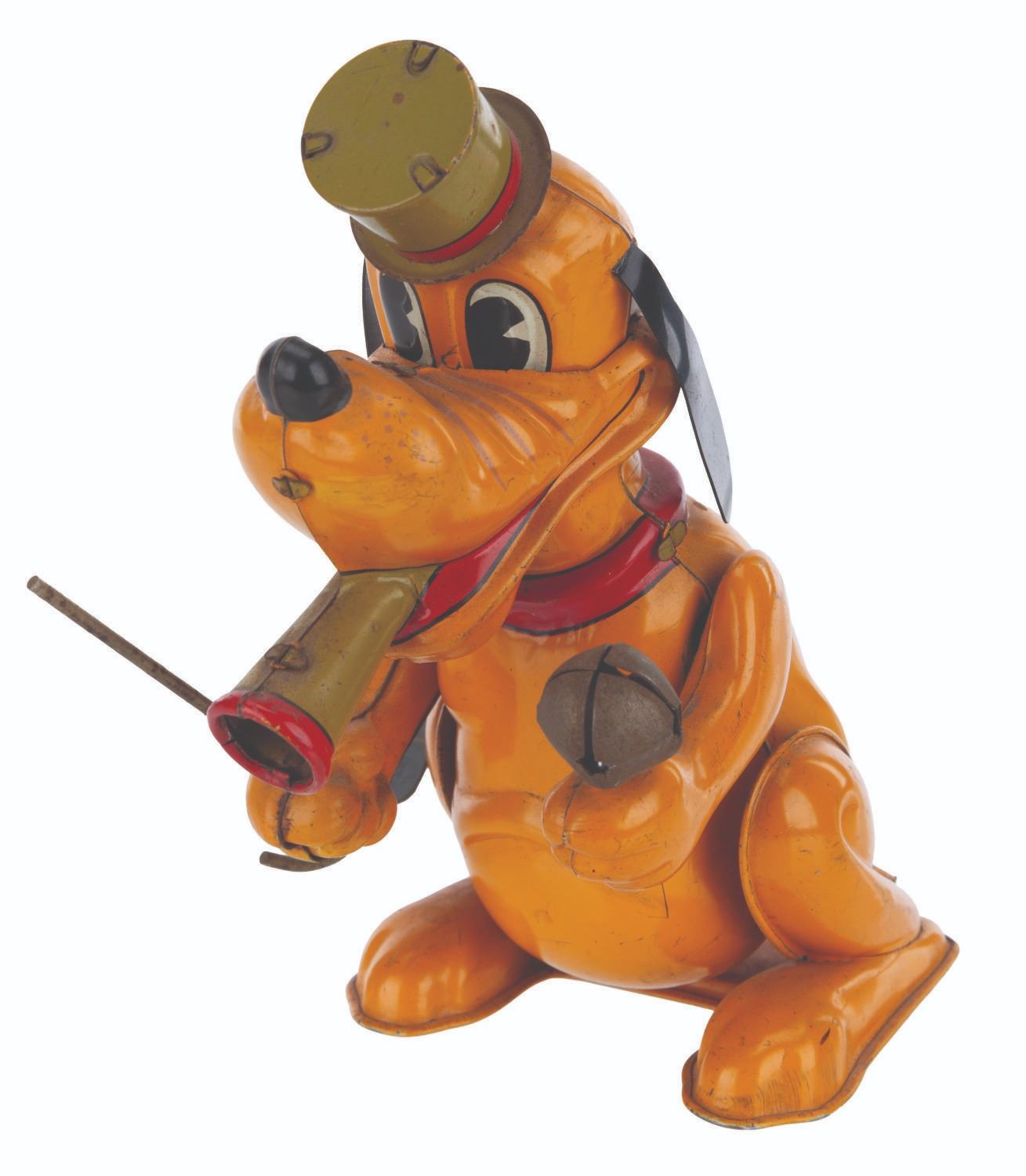 (Linemar, 1950s) A tin-litho Pluto the Drum Major wind-up toy. When wound, Pluto is meant to rock on his feet while moving his arms up and down, ringing the bell in his left paw. It measures 6.5" tall and is in good working condition with light scuffs and wear from age throughout.