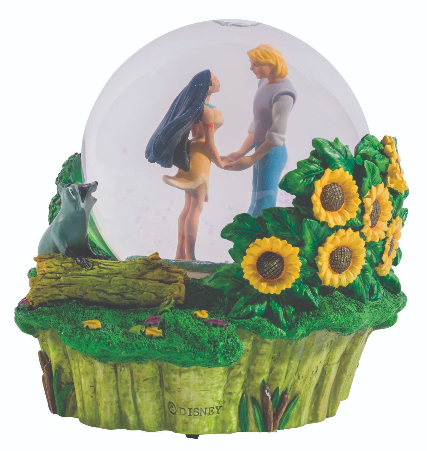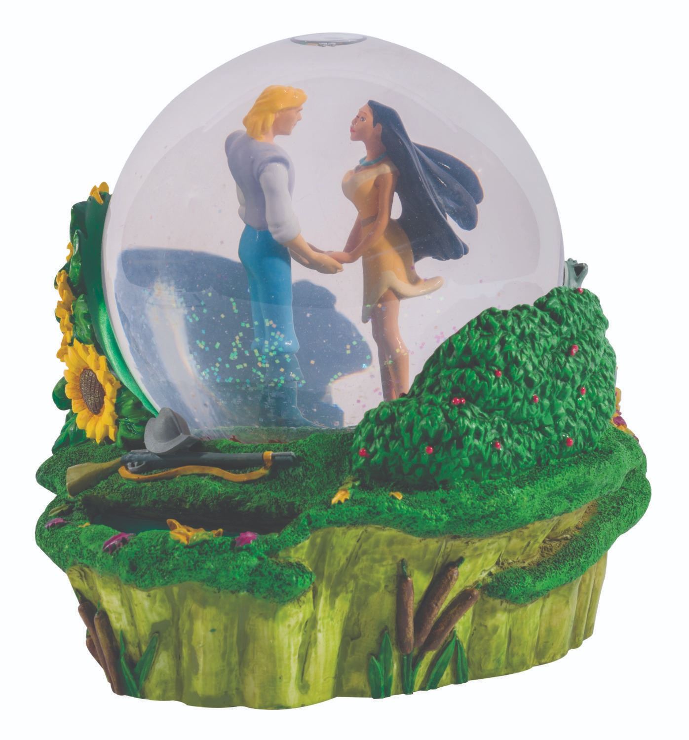 (Disney Store, 1990s) A"Pocahontas" snow globe that plays "The Colors of the Wind" while Pocahontas and John Smith spin inside. Measuring 8" x 6.5" x 7" high, the resin and glass globe is in very good condition with some of the floating glitter elements inside stuck in place to the back.
