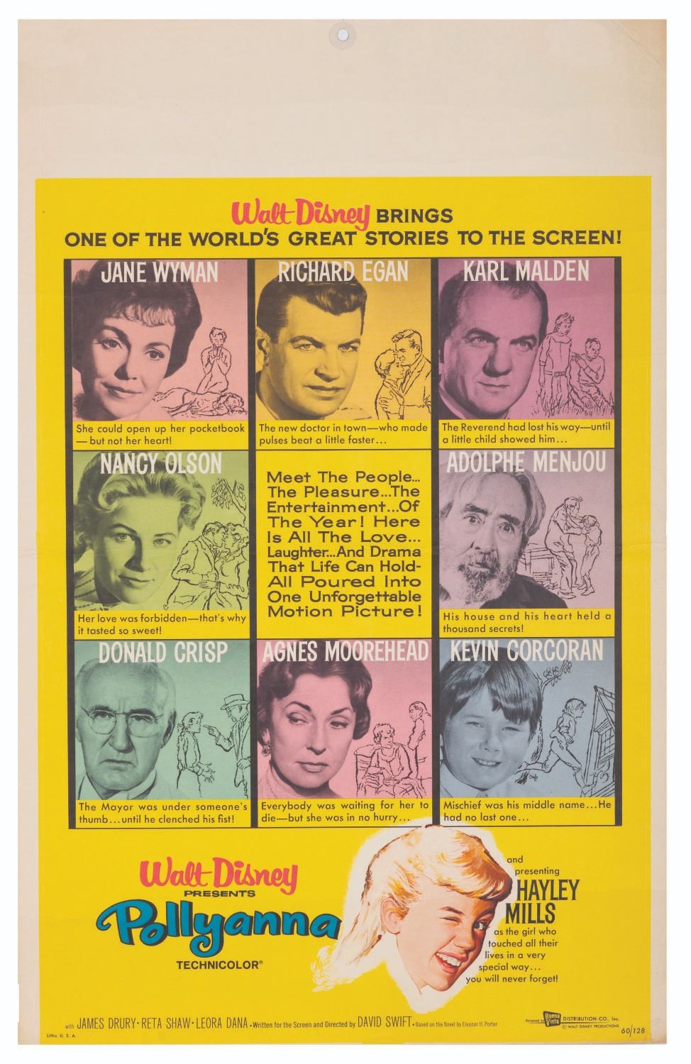(Disney, 1960) A window card poster for the feature film "Pollyanna." Measuring 22" x 14", the window card displays in good condition with some edge wear, including creasing to the corners on the right side. The poster has been folded horizontally with creases across the center, small creases throughout, and minor discoloration on the back. The top center has a reinforced hole for hanging.