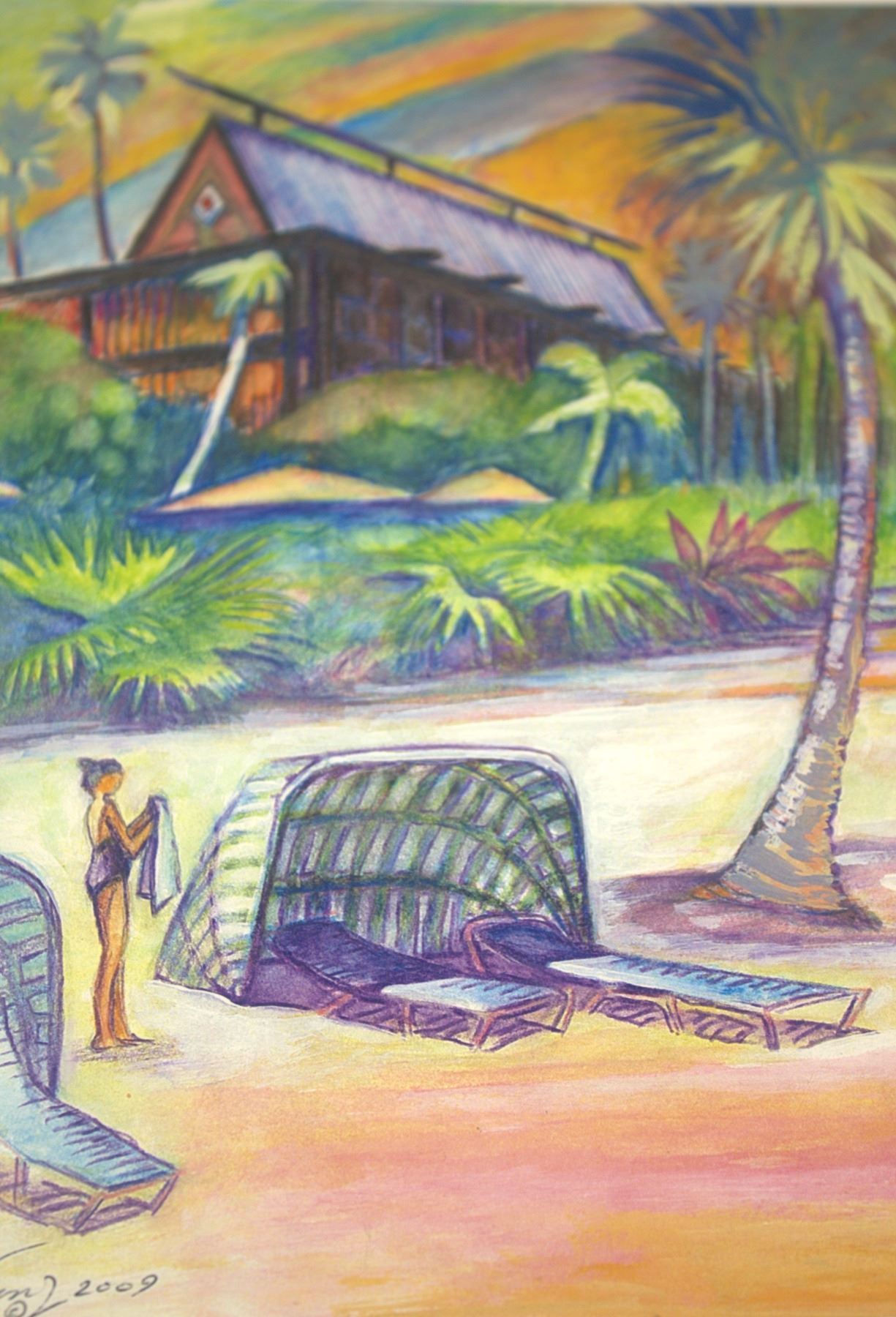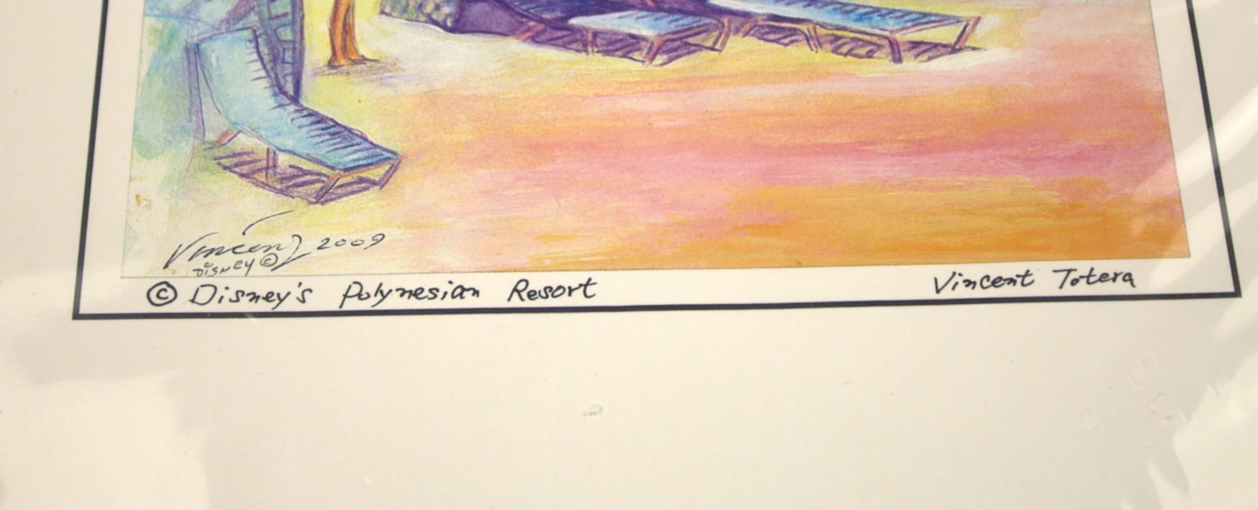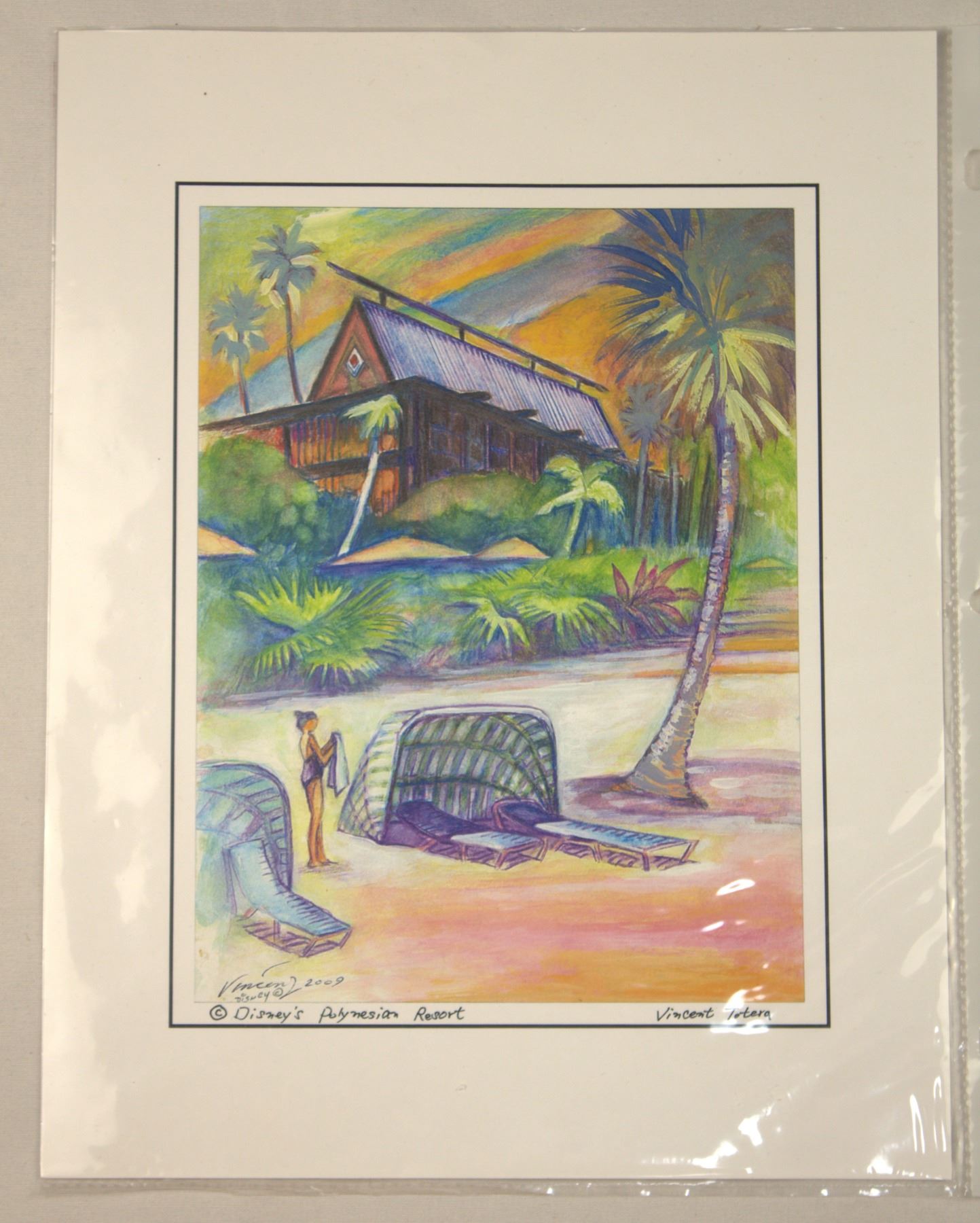 This watercolor reproduction measures 11" x 8.5" and is printed on paper stock. The image is of a clamshell sunshade on the beach with the Polynesian Resort hotel buildings in the background. Vincent 2009 Disney copyright is located in the bottom left of the print. Below the print on the left is Copyright Disney's Grand Floridian Resort and on the right is Vincent Totera written in pen.