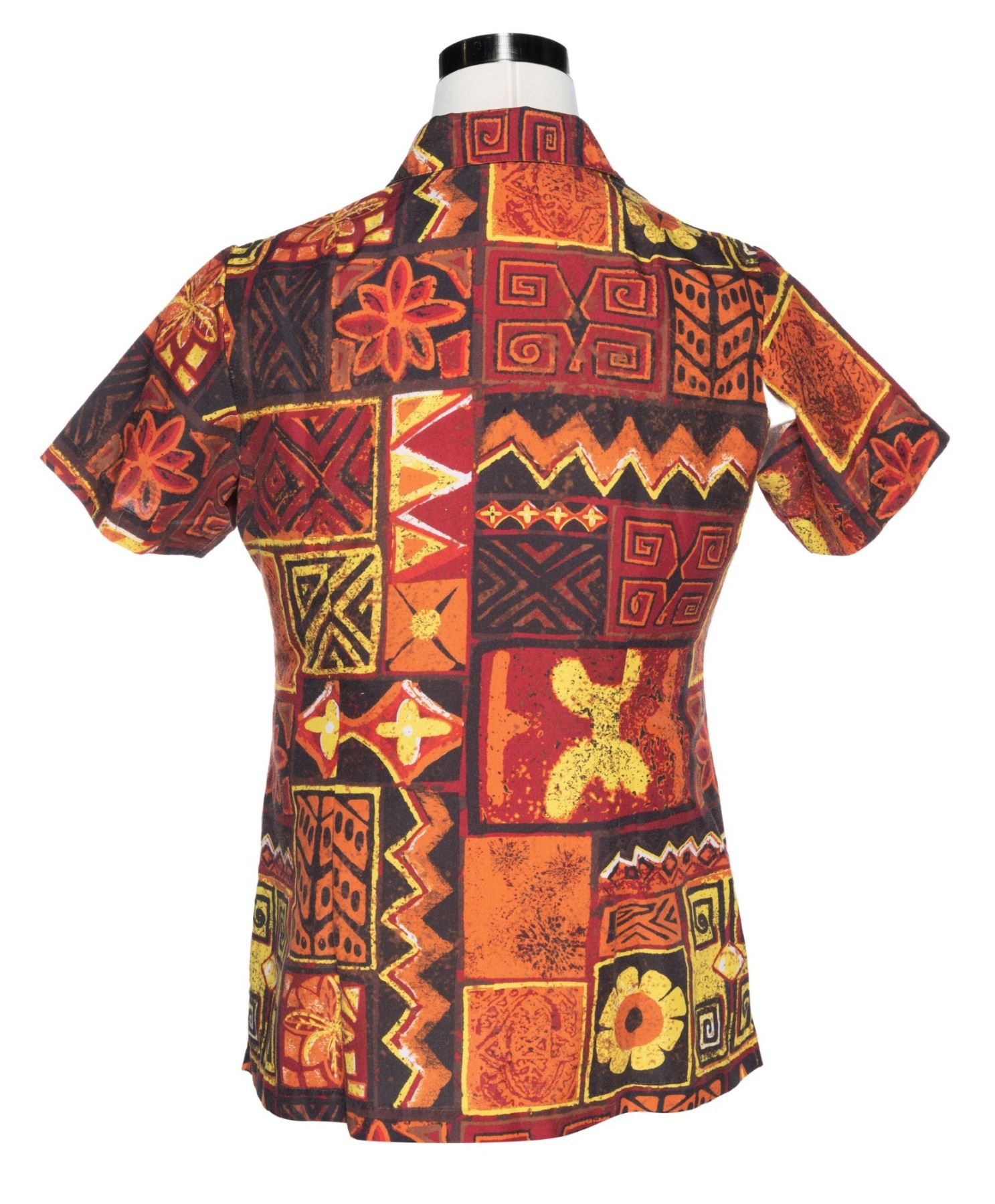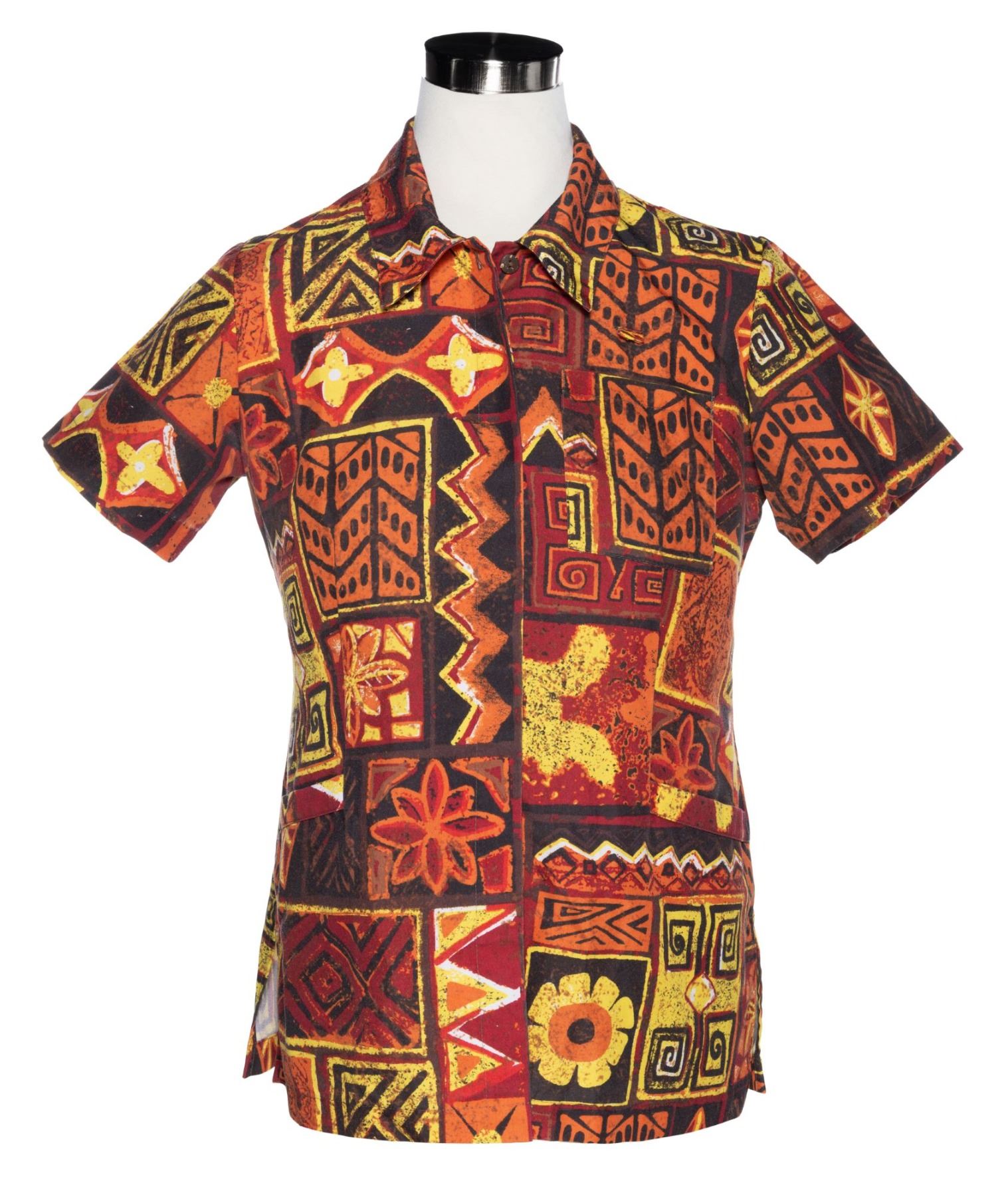 (Disney’s Polynesian Village Resort) An orange shirt worn by Cast Members of Disney's Polynesian Village Resort. Measuring a size male L, the shirt is in fair condition, exhibiting detachment of one sleeve along the seam.