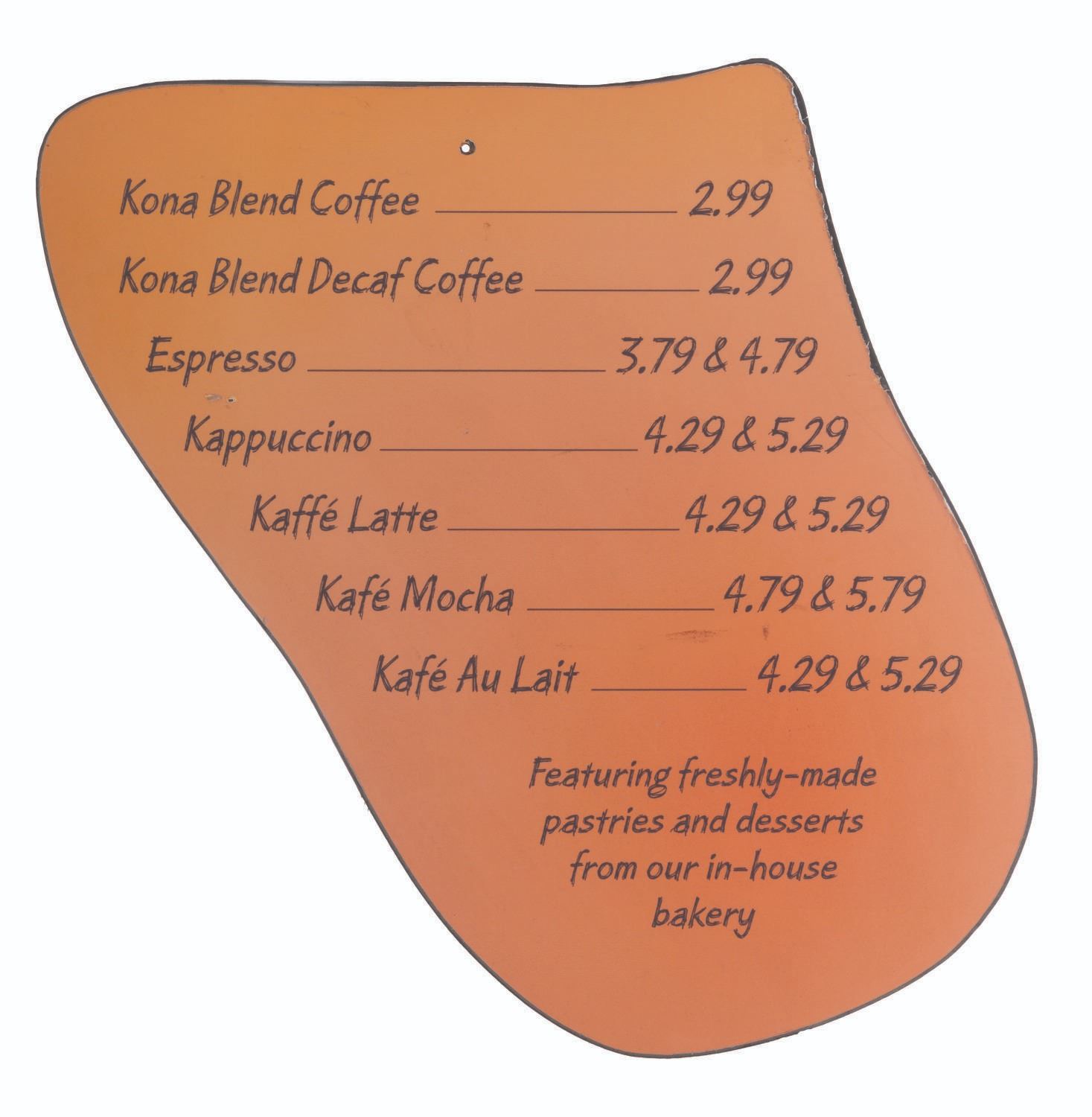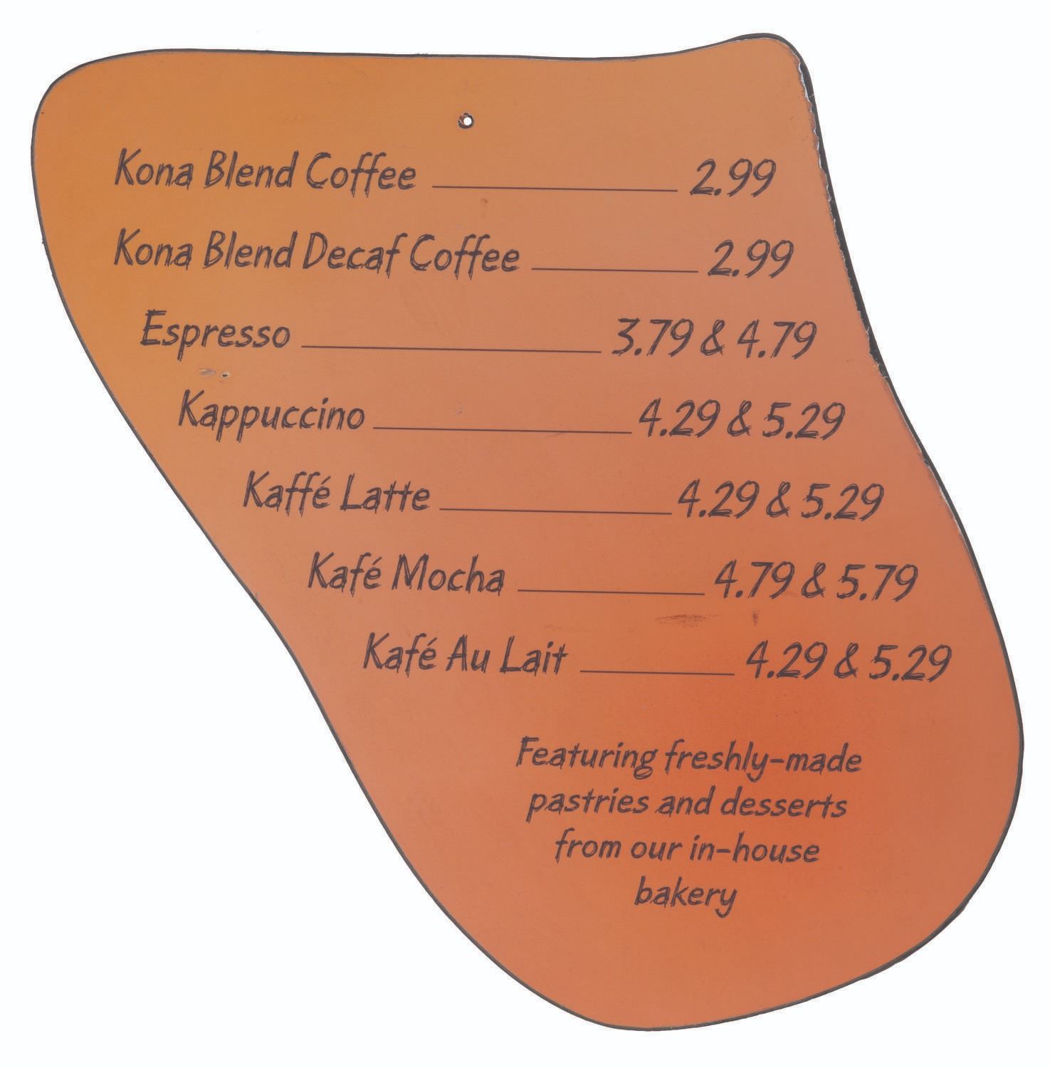 (Disney’s Polynesian Village Resort, 1990s-2000s) A coffee sign from Kona Island, the quick-service dining location in Disney’s Polynesian Village Resort. Measuring 18.25" x 18.25", the sign displays in good condition with typical wear from Resort use, including heavy scratches, scuffs, edge peeling, adhesive residue on the reverse, an intentional hole from display, and wear.