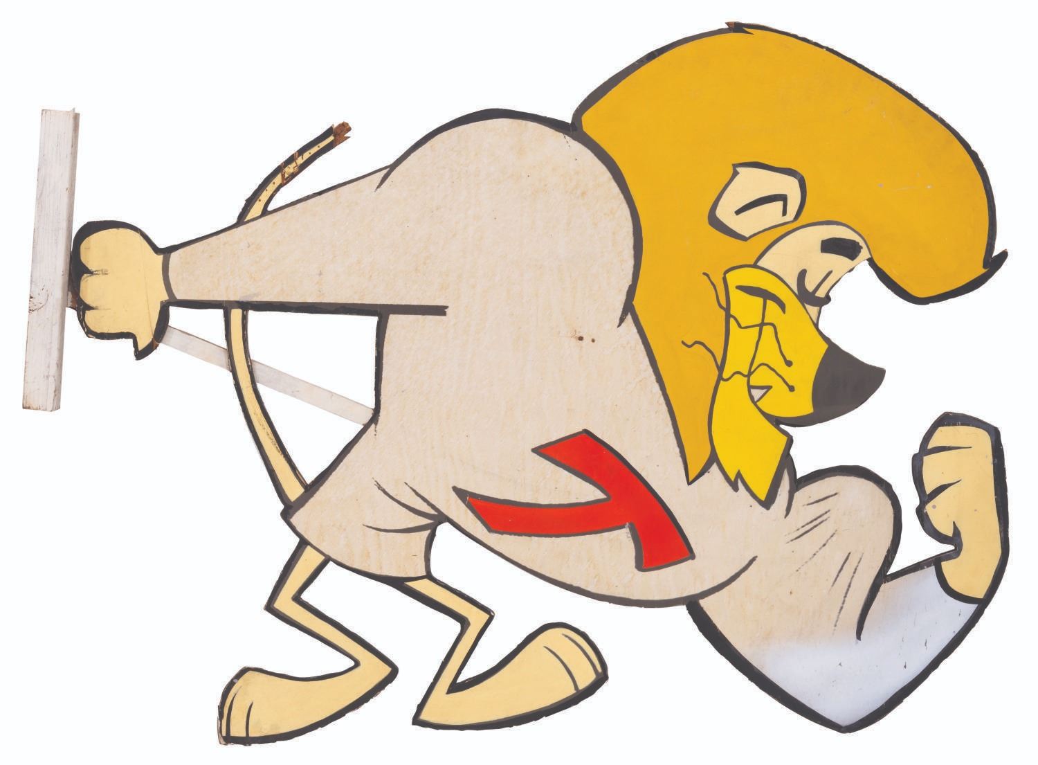 (Clampett, 1960s) A handmade wooden cut-out of Tear-A-Long the Dotted Lion from “Beany and Cecil,” that decorated Bob Clampett’s backyard poolside area. Measuring 47.5” x 37.25” x 0.25”, the cut-out displays in good condition with a broken tail, light soiling, light edge wear, and light discoloration from age. Due to size and weight, this item requires special shipping arrangements. Please inquire before bidding.