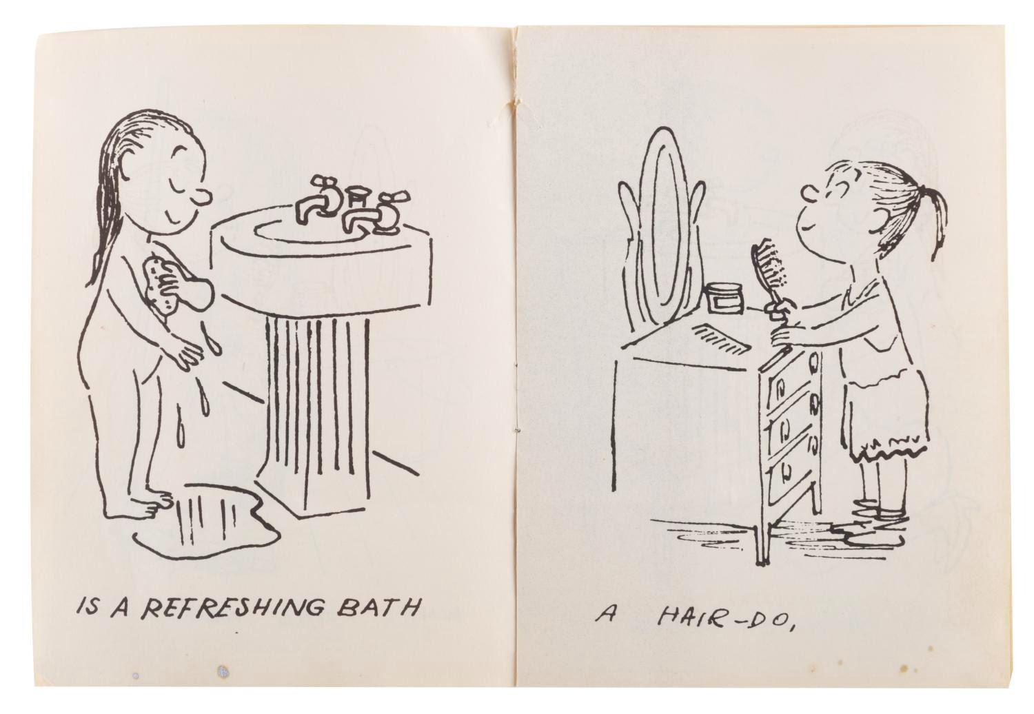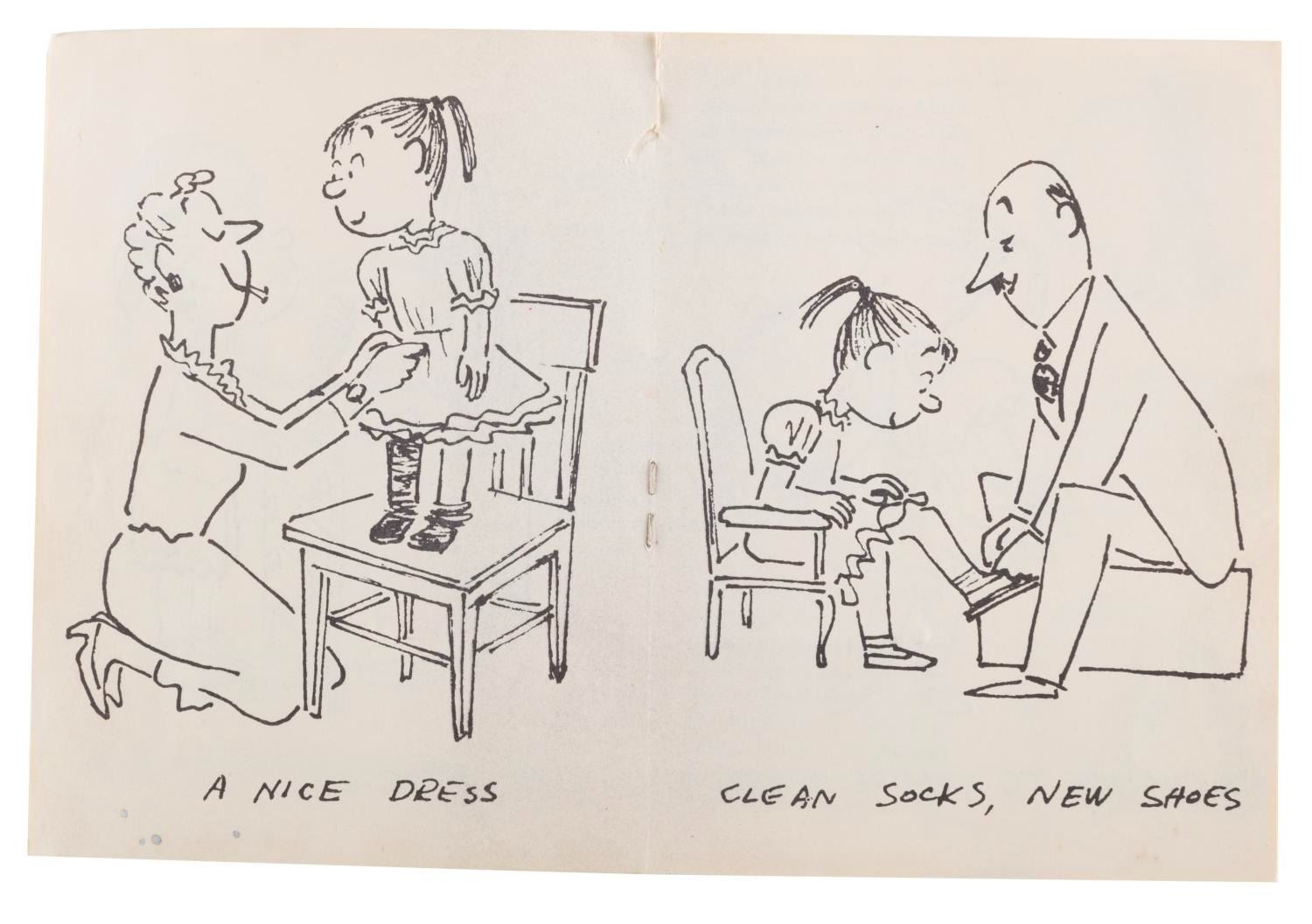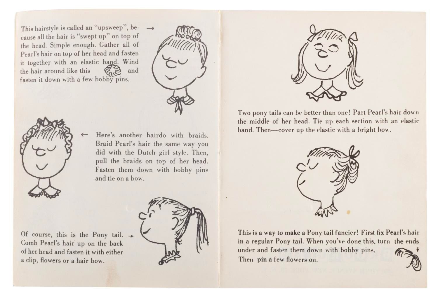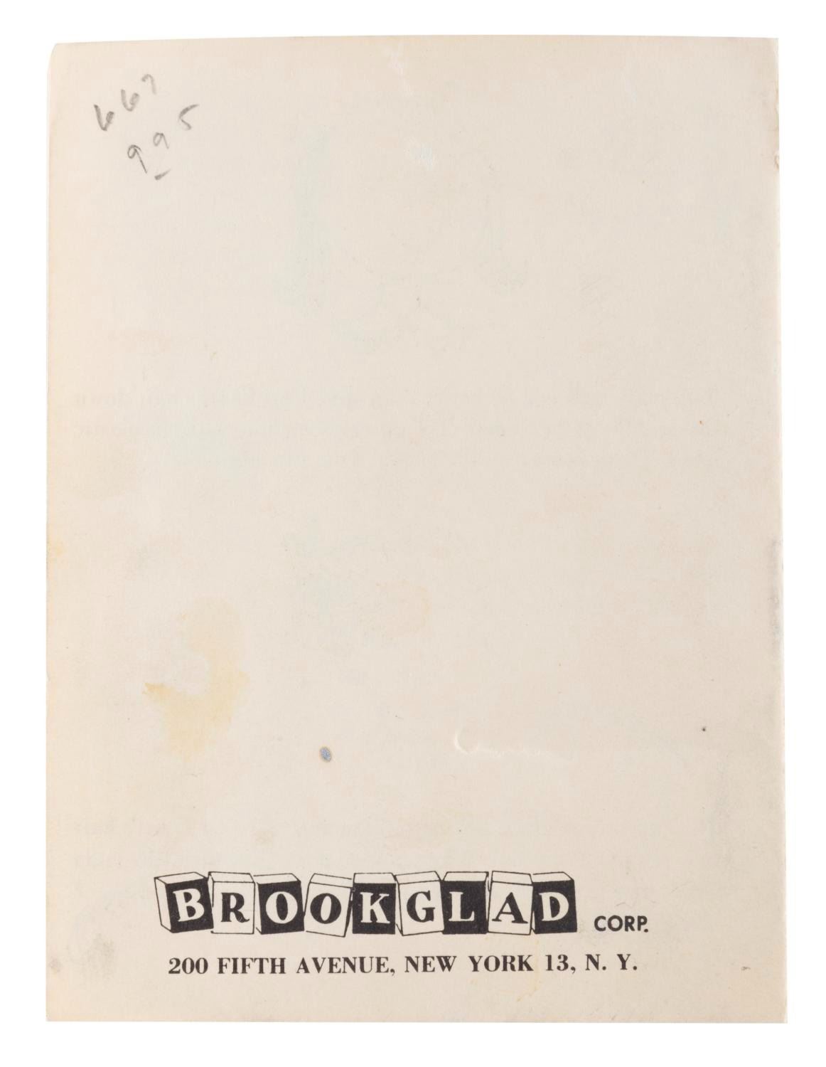 (Brookglad, 1950s) A booklet that originally came with the popular"Poor Pitiful Pearl" doll originally released in 1956. Measuring 4" x 5.25", the 12 page booklet is in good condition with handling wear, a split at the top of the spine, small creases, and some spotting.