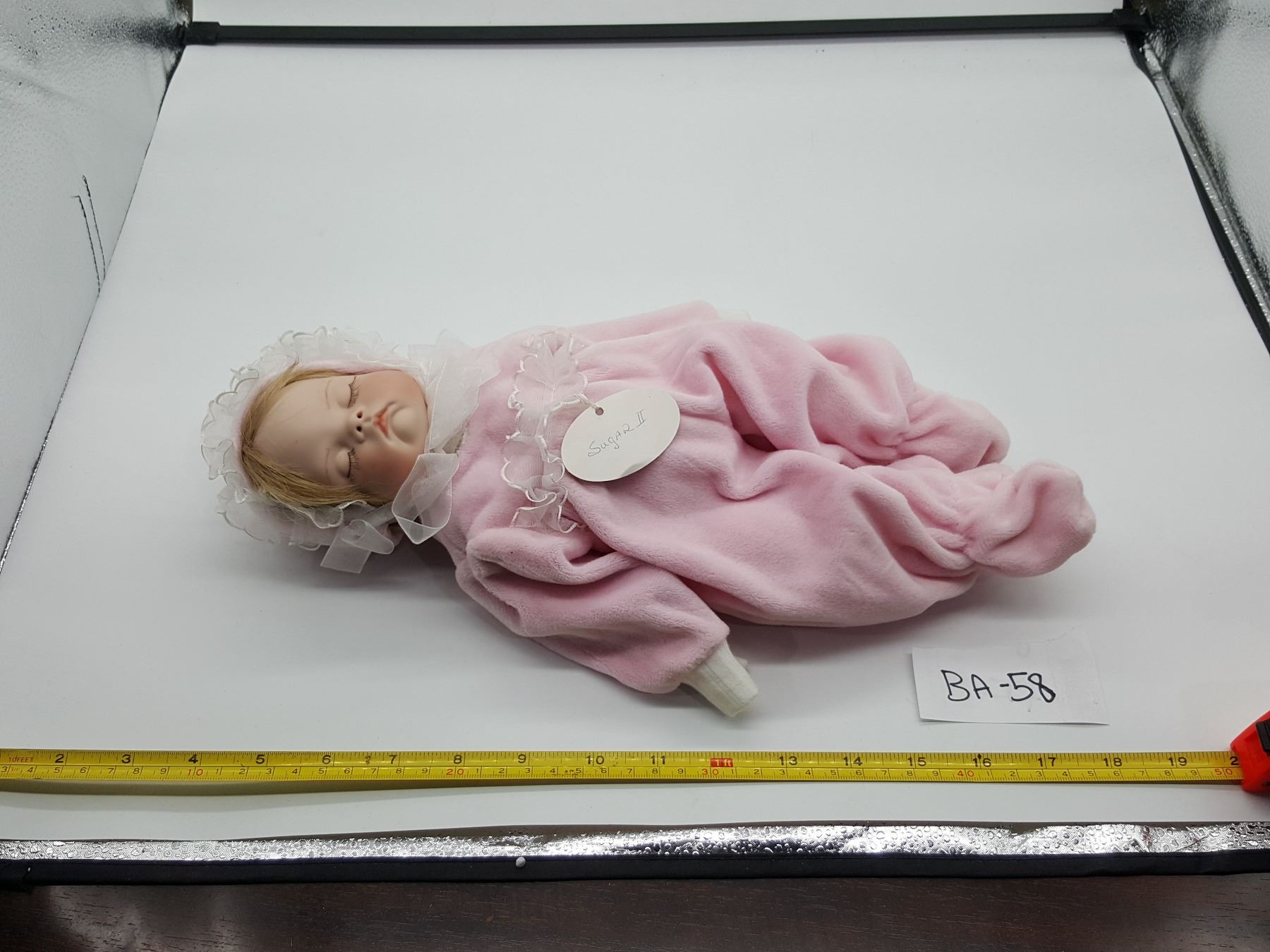 A Porcelain Baby Doll in a Pink Onesie.