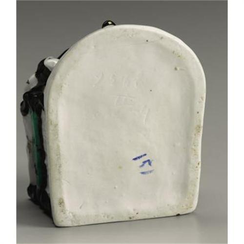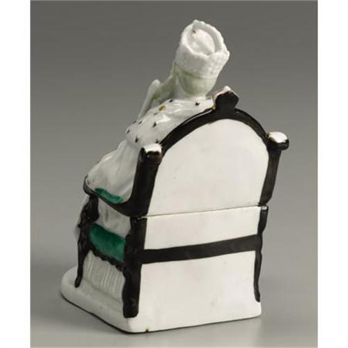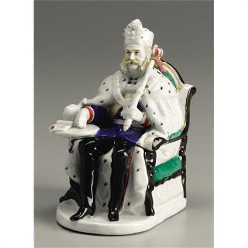<B>A Porcelain Box in the Form of Franz Joseph</B></I><BR><I>Circa 1910</B></I><BR><BR>A figural box of the full-bearded Franz Joseph, Emperor of Austria (r. 1848-1916), King of Hungary (r. 1867-1916) enthroned, wearing ermine robe with imperial collar and crown, orb, and scepter-5 ½ in. high<BR><BR>Provenance:<BR>Purchased from A la Vieille Russie<BR><BR><b>Shipping:</b> Requires 3rd Party Shipping (<a target="_blank" href="http://www.heritageauctions.com/common/shipping.php">view shipping information</a>)