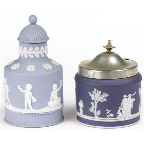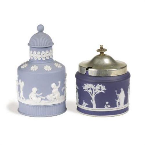 <B>An English Porcelain Jar and Mustard Pot<BR></B></I>Wedgwood<BR>Nineteenth Century<BR>The jasperware covered jar sprigged with white relief of putti at play below a border of florettes; the jasperware mustard pot with electroplate cover, sprigged with white reliefs of classical figures<BR>Impressed mark to the underside<BR>The tallest: 5.5 inches<BR><BR><b>Shipping:</b> Requires 3rd Party Shipping (<a target="_blank" href="http://www.heritageauctions.com/common/shipping.php">view shipping information</a>)