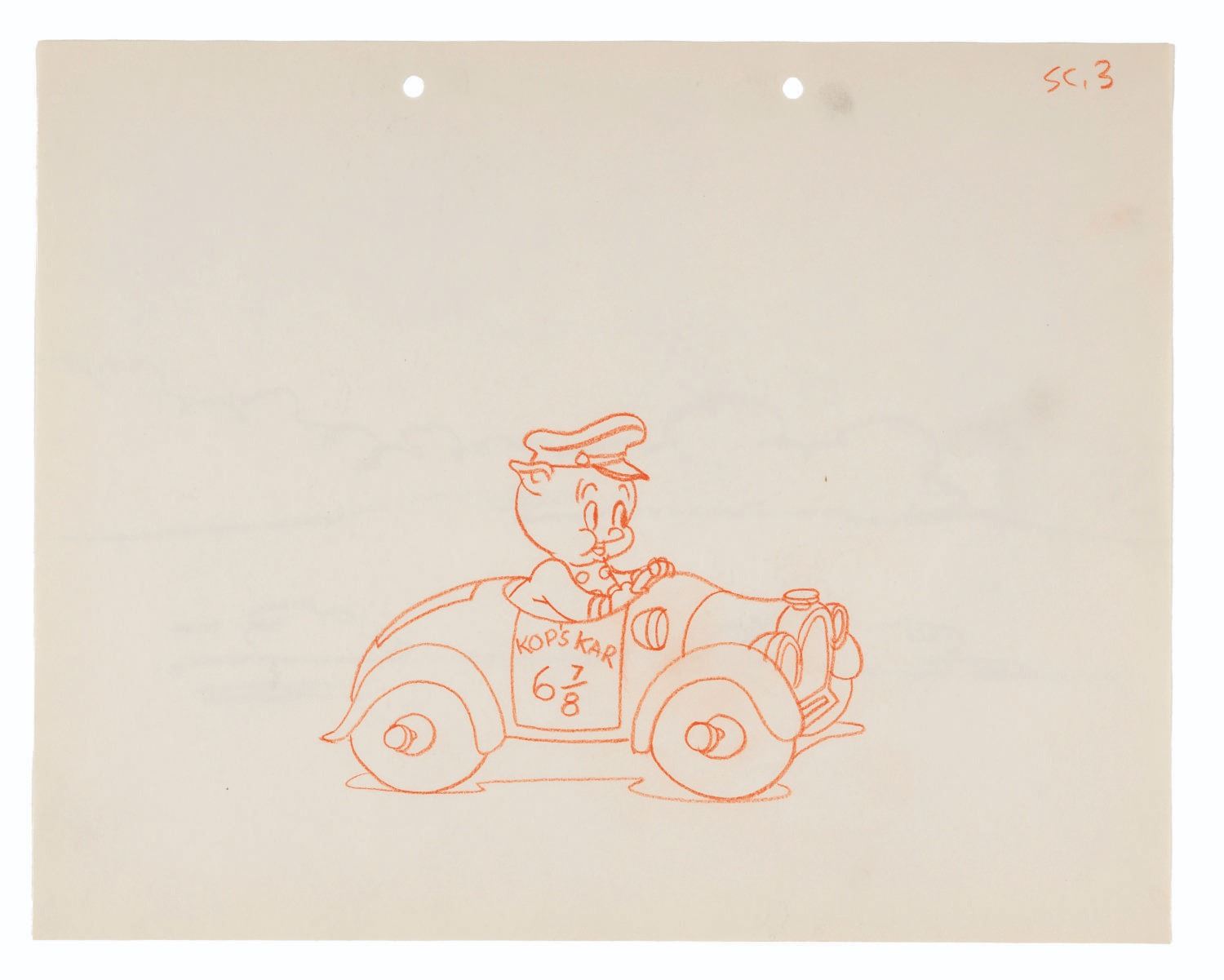 (Schlesinger, 1939) An original layout drawing of Police Officer Porky Pig from the Bob Clampett-directed short “Jeepers Creepers.” With a character image size of 4” x 5.5” on 9.5” x 12” animation paper and accomplished in orange colored pencil, the drawing is in very good condition with light smudges from handling, which do not affect the image.