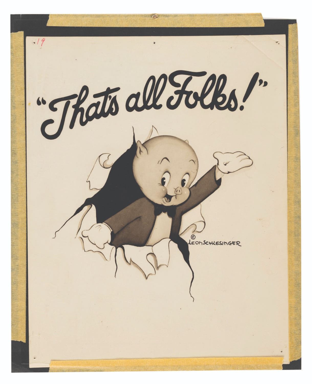 (Schlesinger, 1940s) A production-used photo print of a “That’s all Folks!” Porky Pig illustration with a hand-written Leon Schlesinger copyright. Measuring 10.25” x 8” and taped to a 9” x 11” piece of black paper with a plastic protective sheet, the photo is in good condition with edge wear, creases, folds to the top right corner, pinholes, and toning.