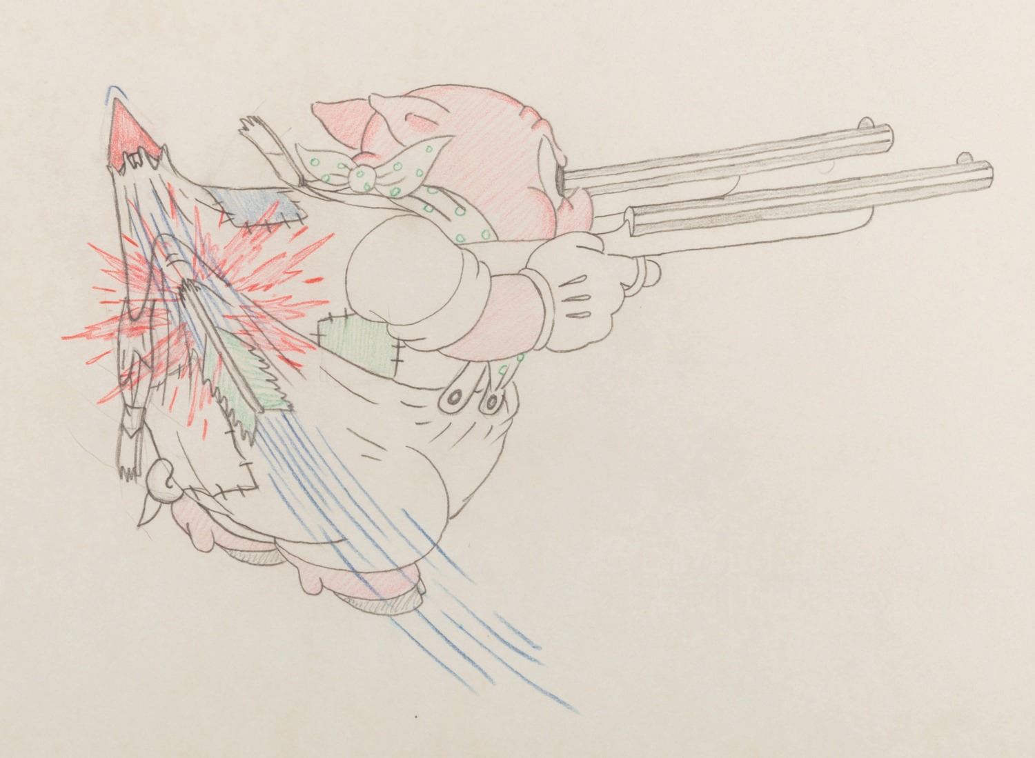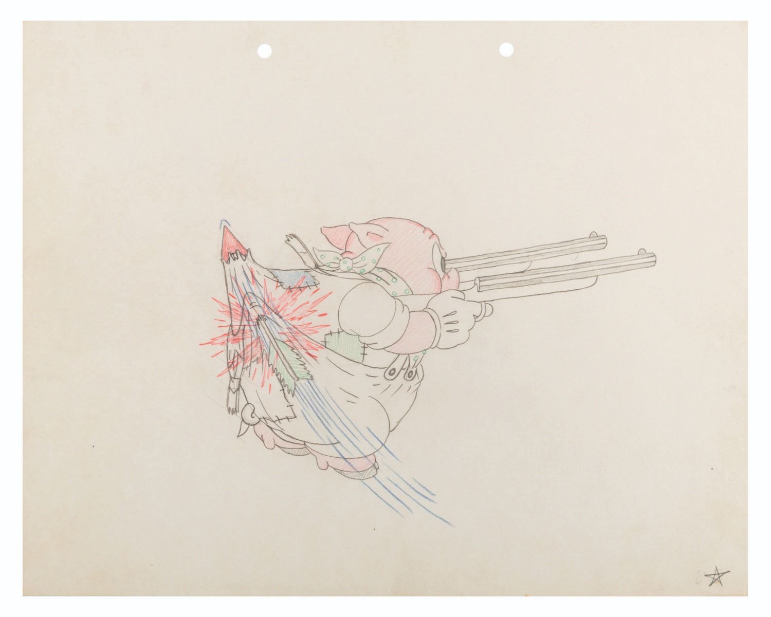 (Schlesinger, 1936) An original production drawing of Porky Pig from the Looney Tunes short "Westward Whoa.” With a character image size of 5” x 7.25” on a 9.5” x 12” piece of animation paper, the graphite and colored pencil drawing is in very good condition with creases and light discoloration from age.