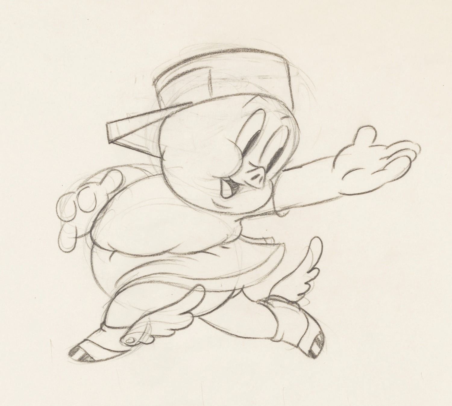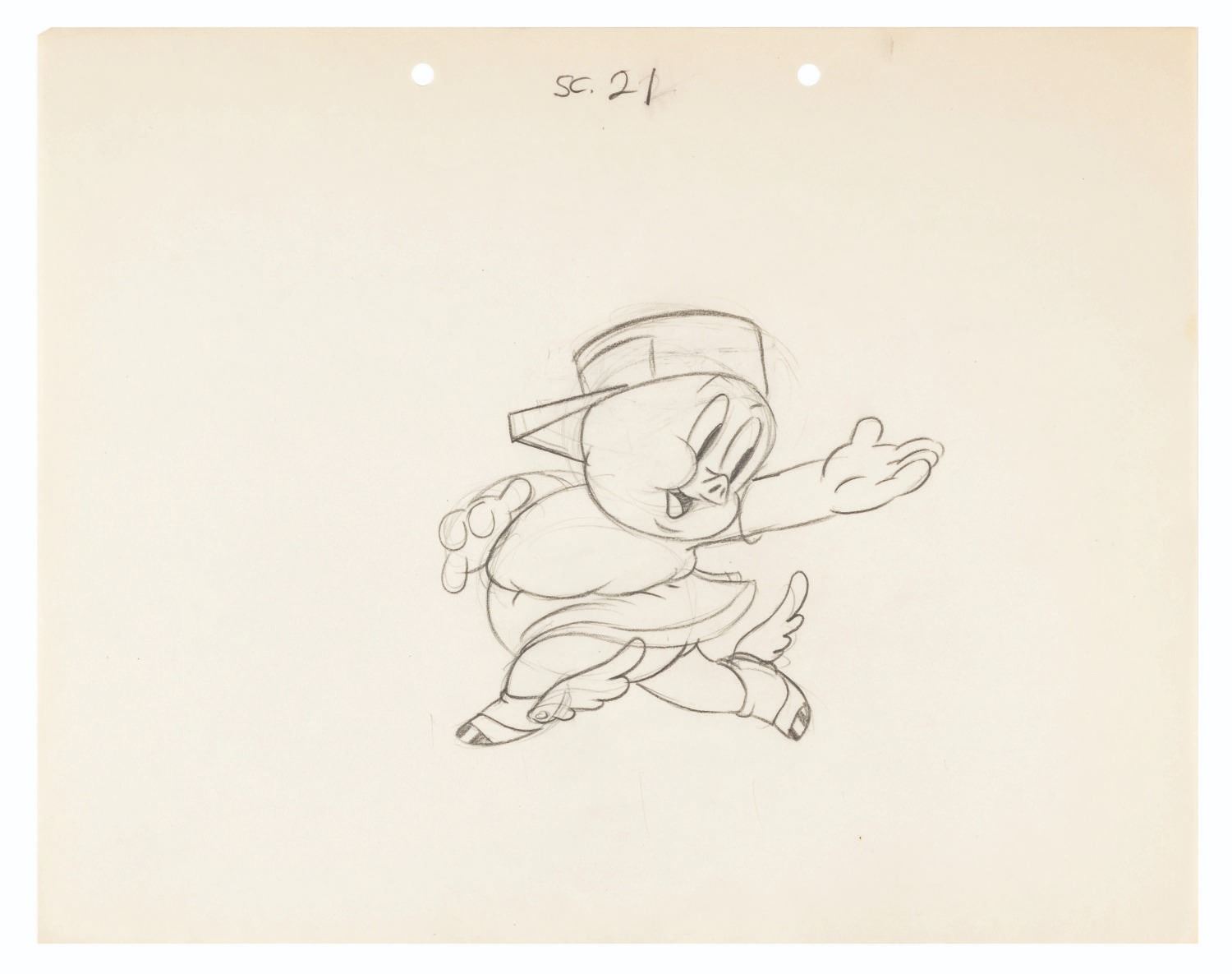 (Schlesinger, 1937) An original production drawing from the Looney Tunes cartoon “Porky’s Hero Agency,” directed by Bob Clampett. With an image size of 4.5” x 5.25” on 9.5” x 12” animation paper, the drawing is in very good condition with typical light wear from production use and age.
