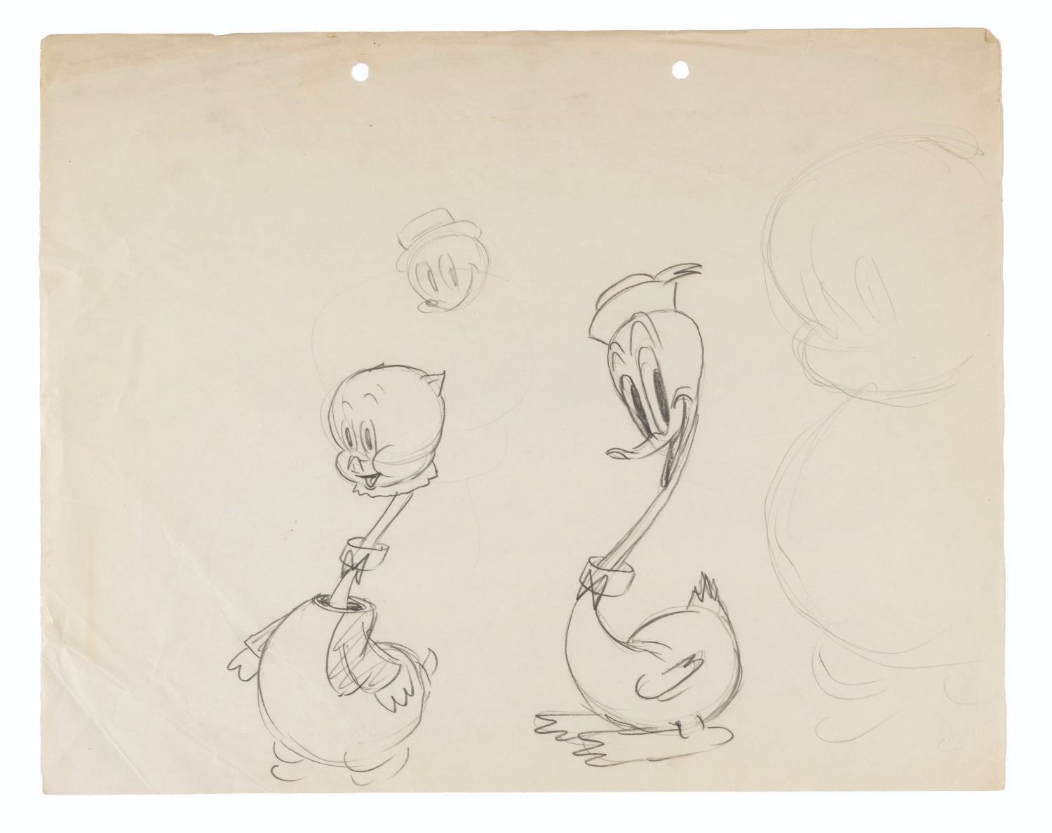 (Schlesinger, 1938) A story development sketch for “Porky’s Party” by Bob Clampett. Clampett explored both the structure of the rarely seen character Goosey and an odd cross between his anatomy and Porky Pig’s. The page also includes another character’s face and a rough outline of Porky. with an overall image size of 8” x 9.75” on 9.5” x 12” animation paper, the drawing accomplished in pencil displays in good condition with edge wear and creasing mainly to the top and left edges of the paper.