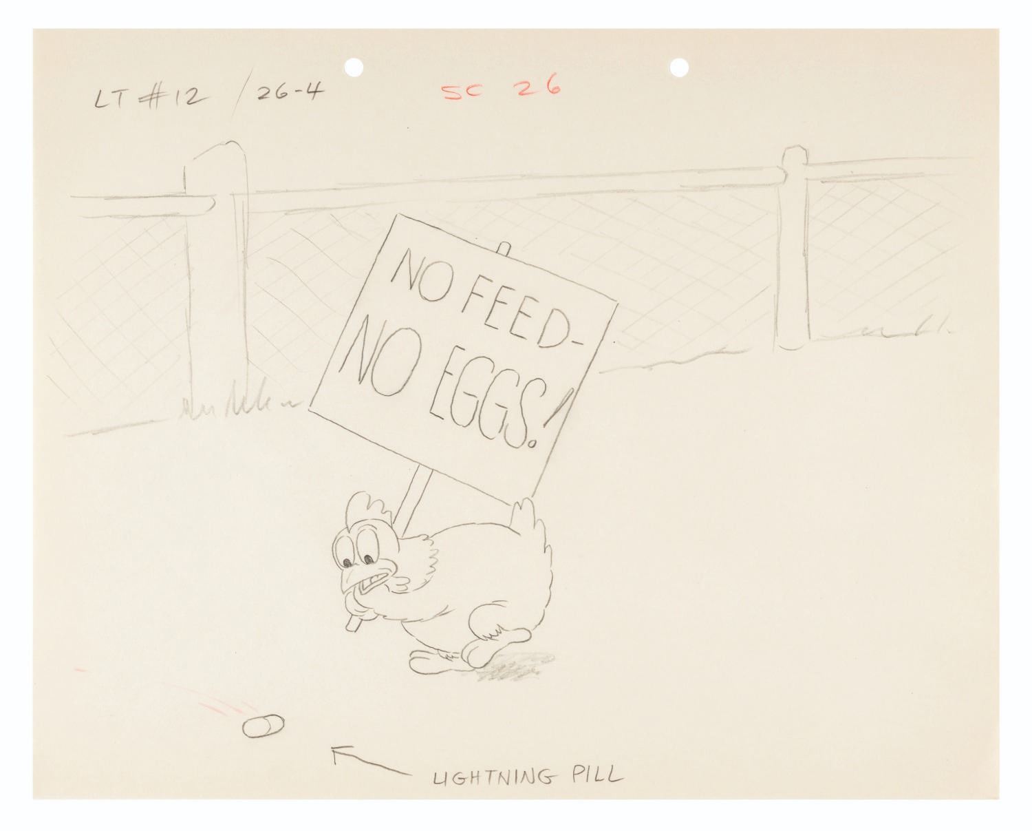 (Schlesinger, 1936) A “Porky the Rain-Maker” layout drawing of a protesting chicken spotting a lightning pill. With an image size of 7.5” x 11” on 9.5” x 12” animation paper, the drawing accomplished in graphite and red pencil is in very good condition with very light discoloration from age.