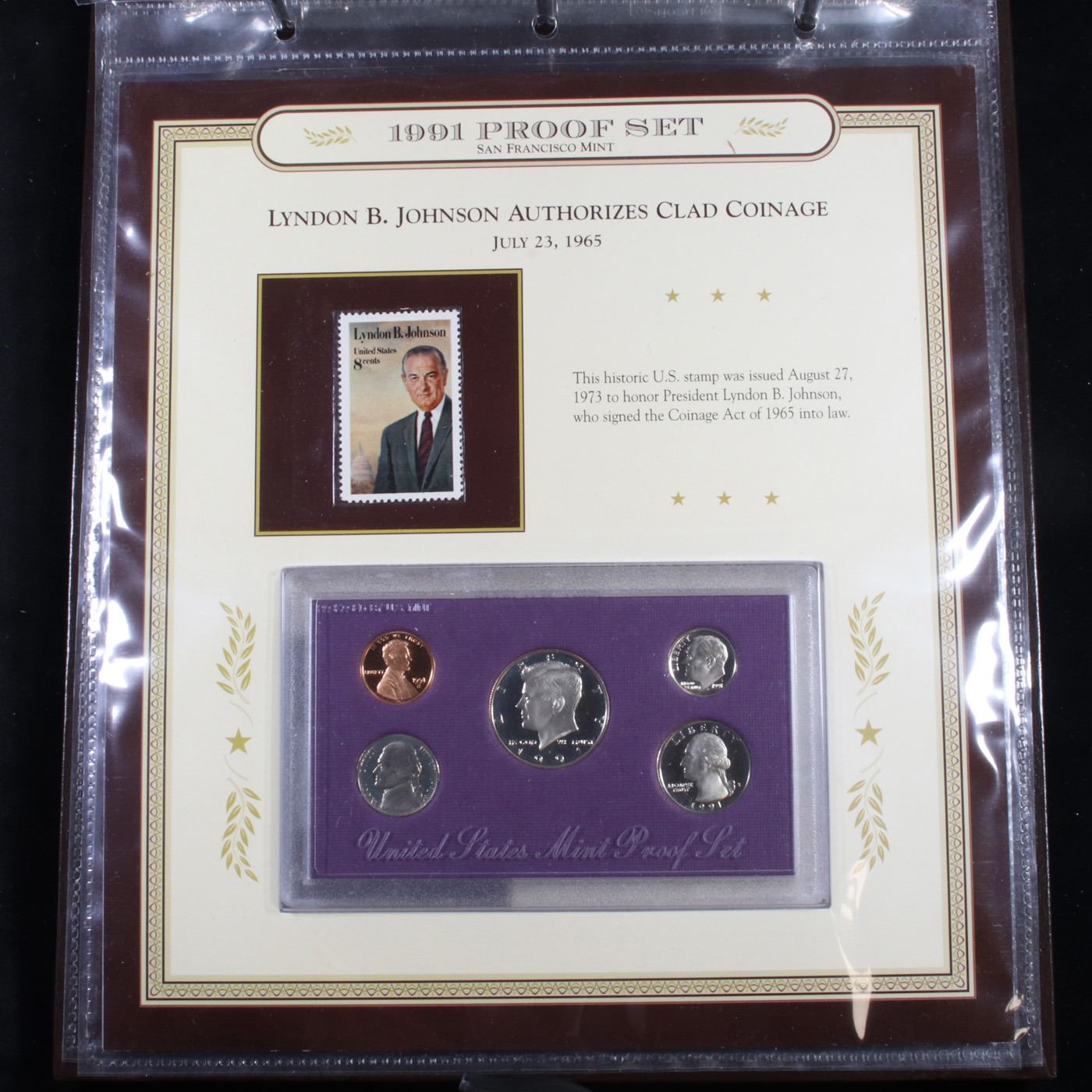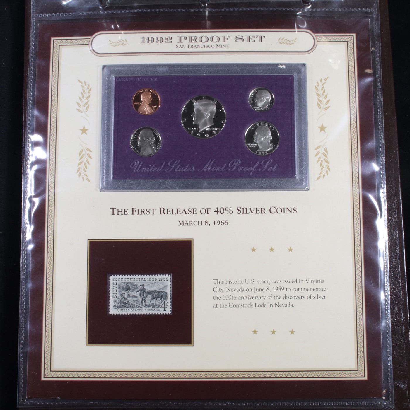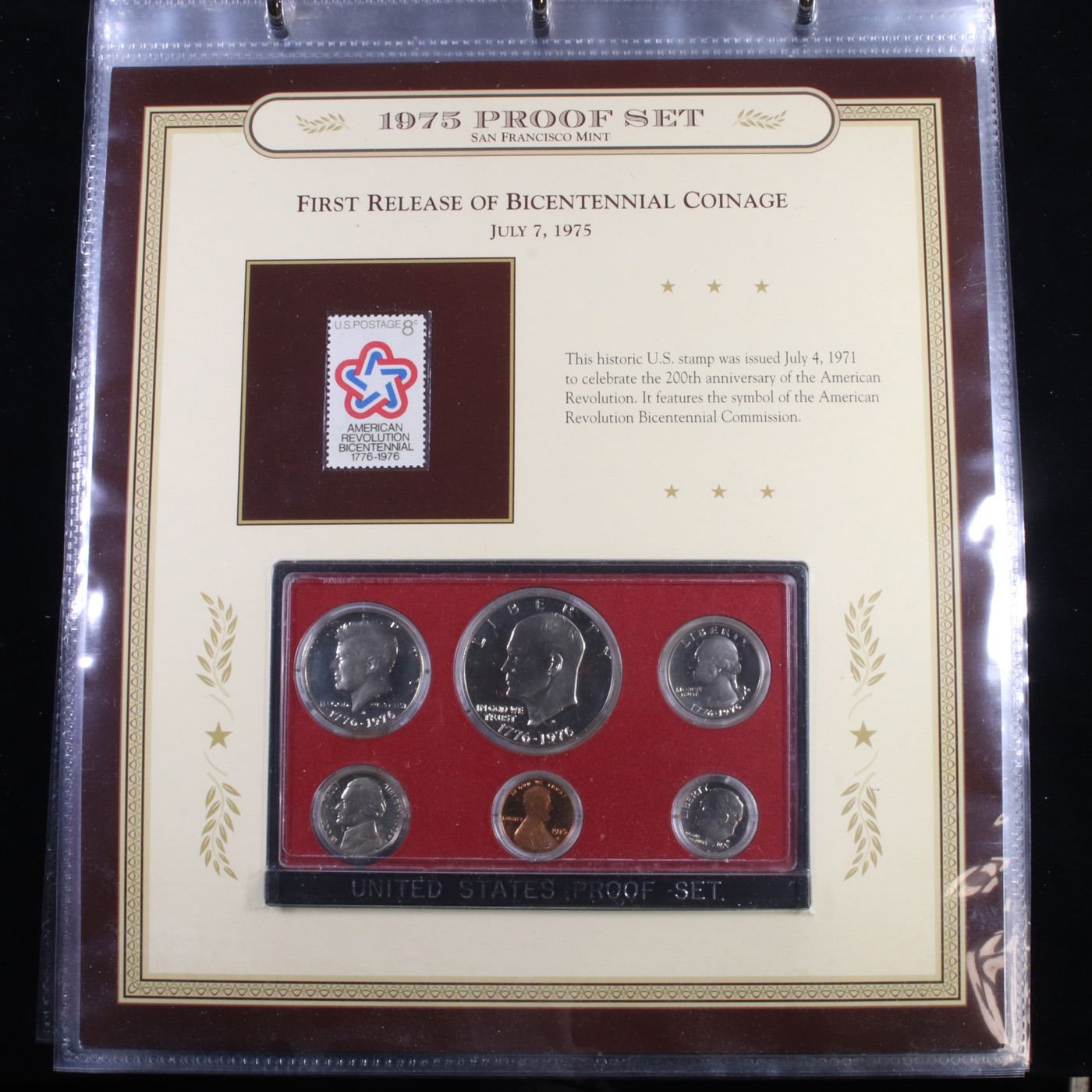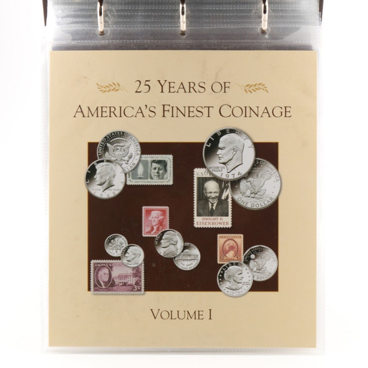 A Postal Commemorative Set, 25 Years Of Americas Finest Coinage Incomplete, in a brown binder Grades. A Postal Commemorative Set, 25 Years Of Americas Finest Coinage Incomplete, in a brown binder. A Postal Commemorative Society set. The set is not complete. It contains 14 years of proof sets mounted on an informational card with a commemorative stamp corresponding to the same year as the proof set.All housed in a brown vinyl binder. The years included are 1970, 1973, 1974, 1975, 1976, 1977, 1978, 1979, 1981, 1986, 1990, 1991, and 1992.