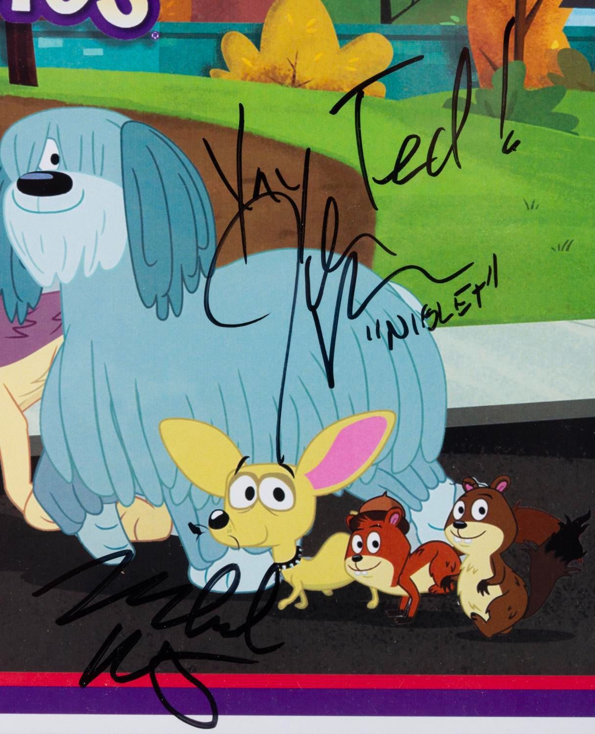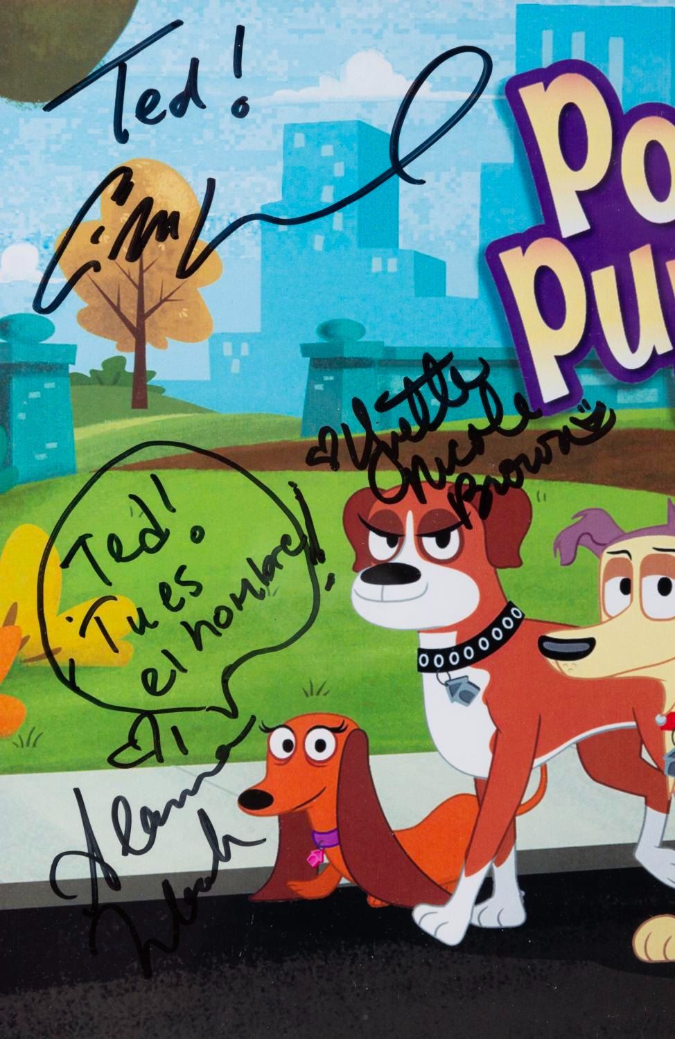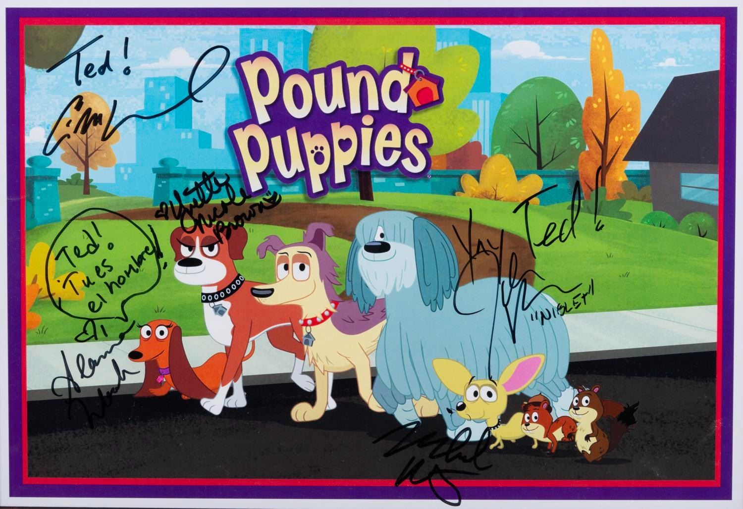 (Hasbro Studios, 2010) A print of Pound Puppies signed by five members of the voice cast. Included are signatures from Eric McCormack (Lucky), Alanna Ubach (Strudel), Yvette Nicole Brown (Cookie), John DiMaggio (Niblet), and Michael Rapaport (Squirt). With an image size of 9” x 13” in a 12.5” x 17” matte, the piece is in fine condition.