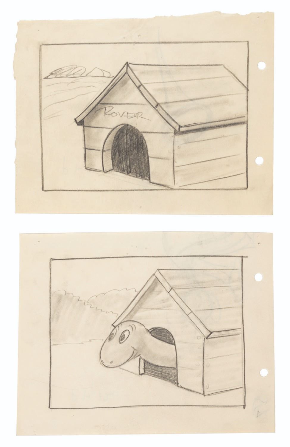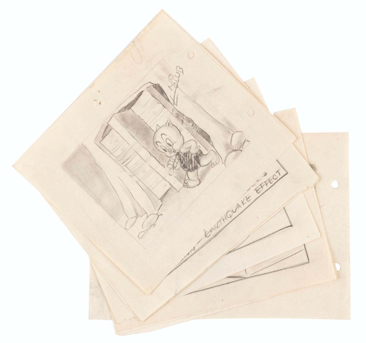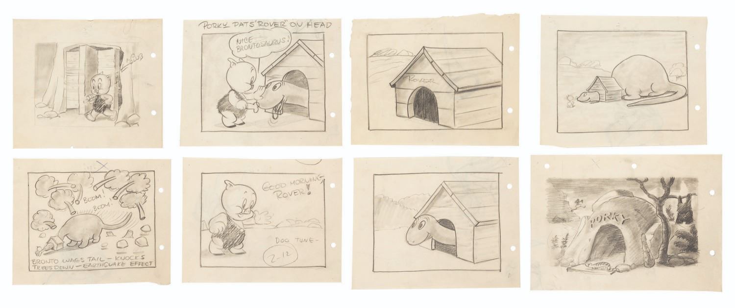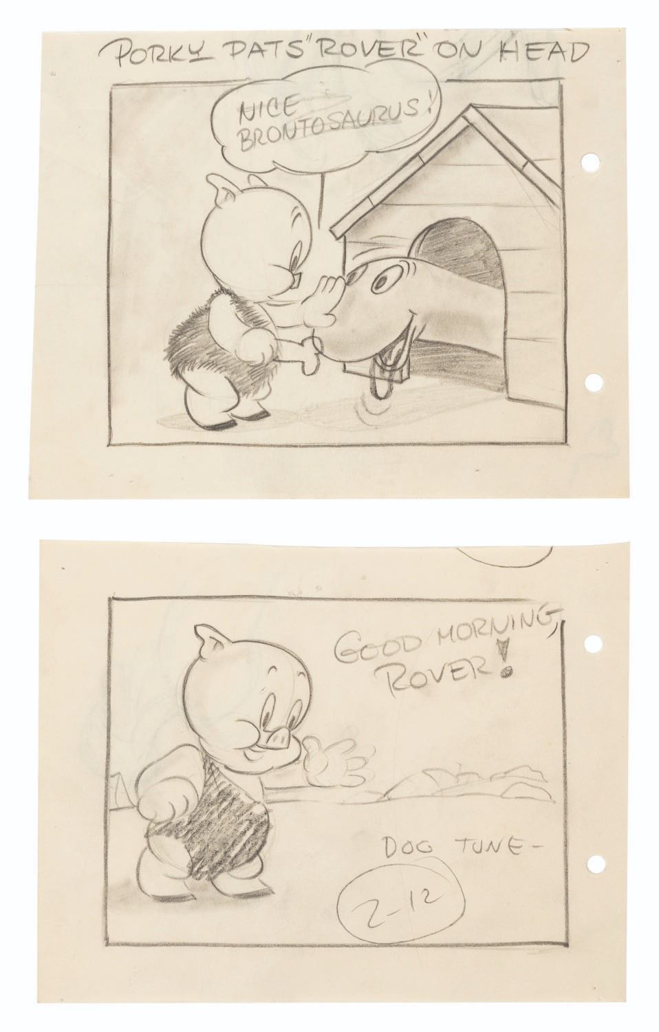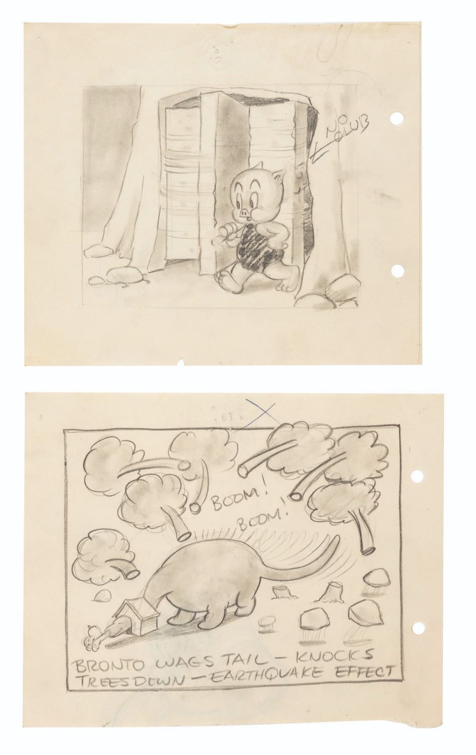 (Schlesinger, 1940) A collection of eight storyboard panels featuring Porky and Rover from the Looney Tunes short “Prehistoric Porky,” directed by Bob Clampett. Accomplished in graphite and ranging in size from 6.25” x 7.25” to 6.25” x 8.75”, the panels display in very good production-used condition with creases, pinholes, some corner tears, and light discoloration from age.