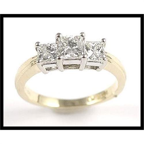 This sparkle lady's 14K yellow gold diamond ring is set with 3 princess cut diamonds that have 14K white gold prongs. The estimated total diamond weight is 1.10 carats. This sized 4 3/4 ring weights 2.90 grams.