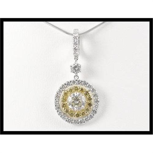 This sparkle 18K white gold and yellow gold pendant contains with a brilliant cut diamond weighing approximately 0.85 carats that is set in the middle of the pendant. In addition, there are 14 pieces of round cut golden diamonds weighing approximately 0.33 carats total weight and 29 full cut white diamonds with an estimated total weight of 0.65 carats are set surrounded the center brilliant cut diamond. The pendant with the bale measures 1.21 inches in length and the width is 0.56 inches. The brilliant cut diamond's clarity grade is SI2 to SI3 and the color grade is L to M.