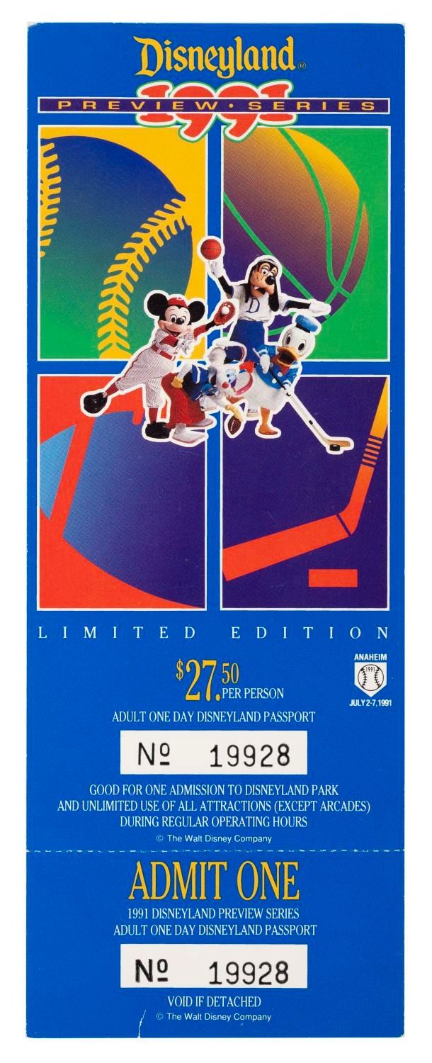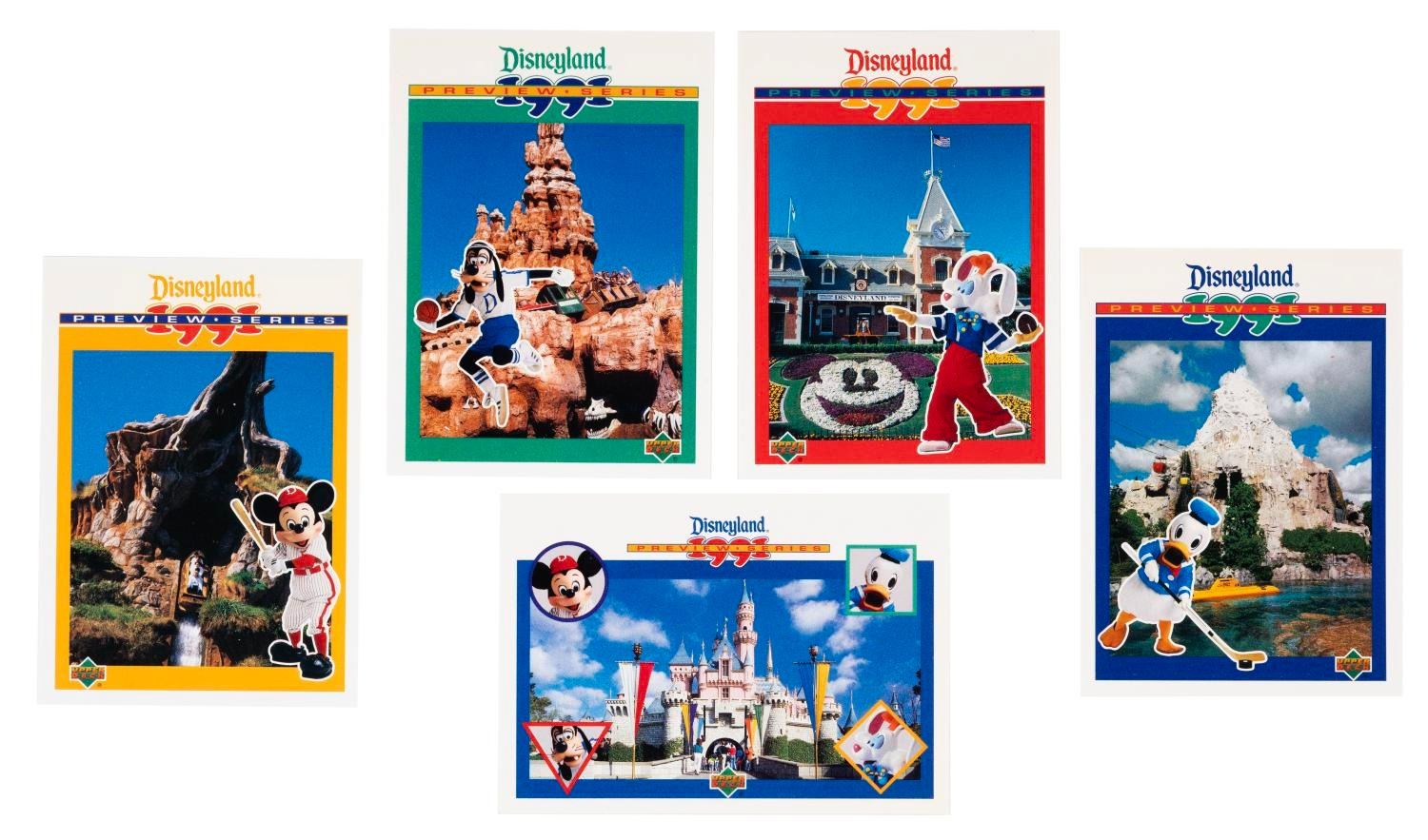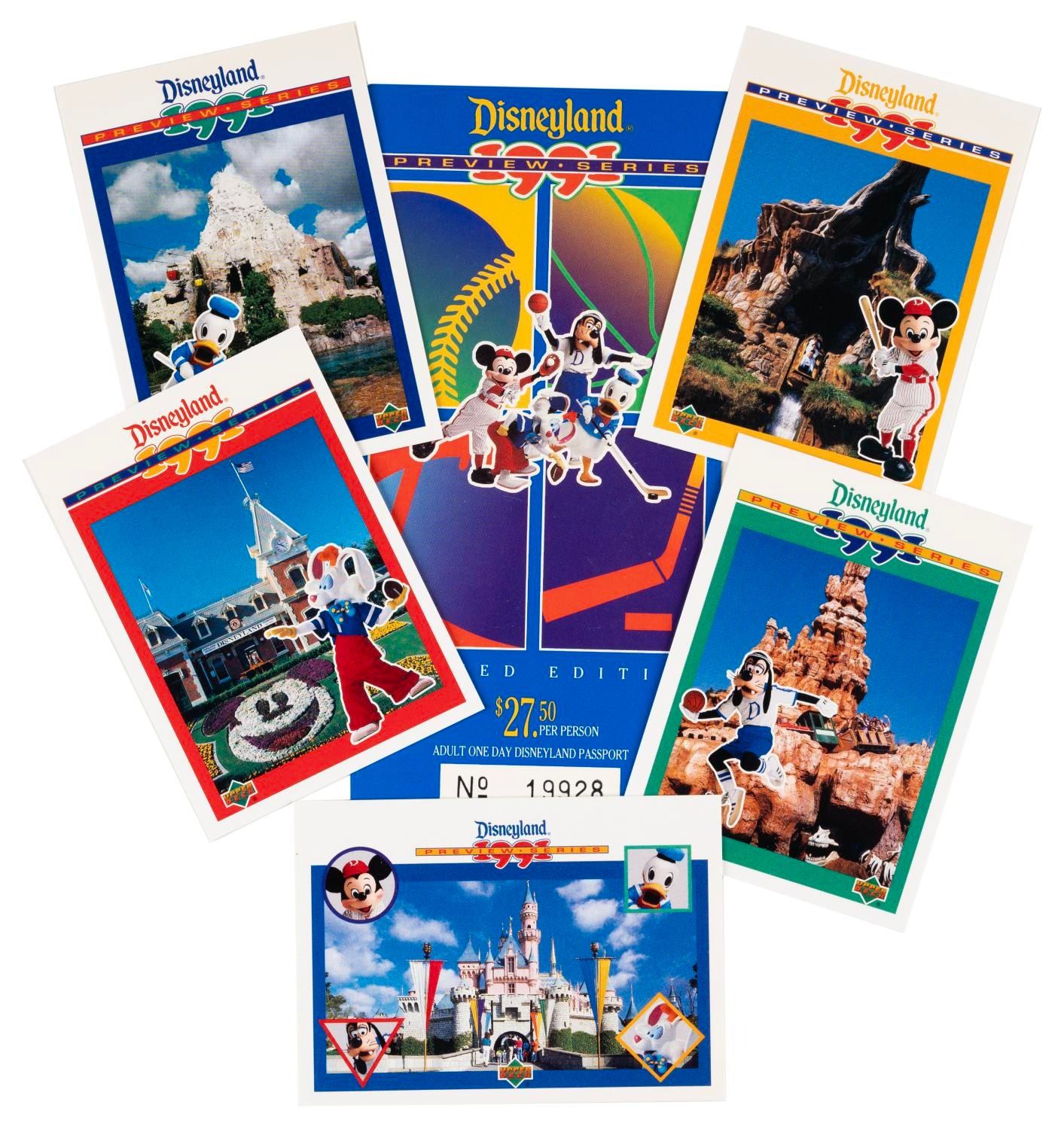 (Disneyland/Upper Deck, 1991) An unused Disneyland One-Day Passport, numbered 19928, and a complete set of five Preview Series trading cards by Upper Deck. The sports-themed passport measures 3” x 8” and the cards measure 2.5” x 3.5” each, in good to fine condition with scratches, creases, and stains on the reverse of the passport.