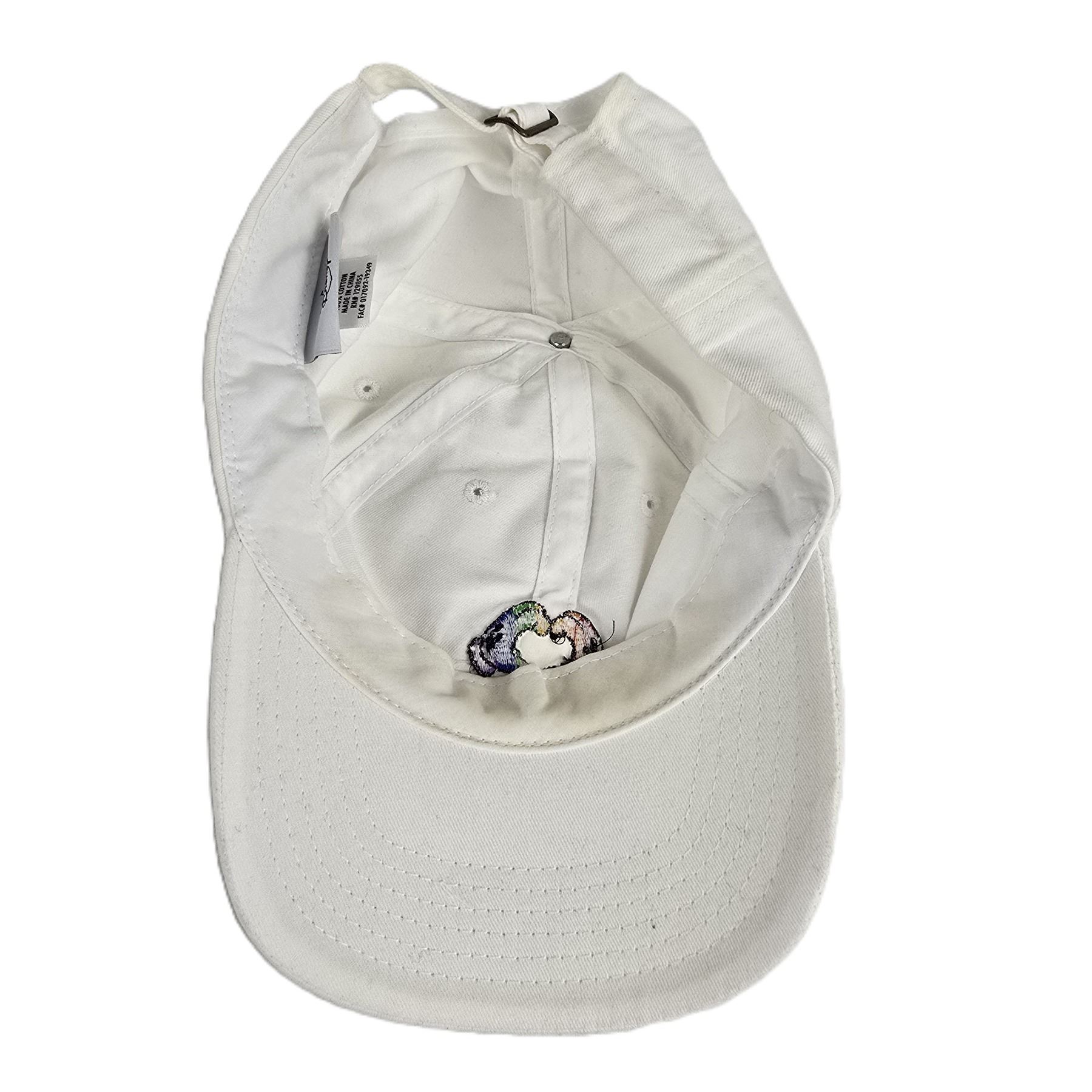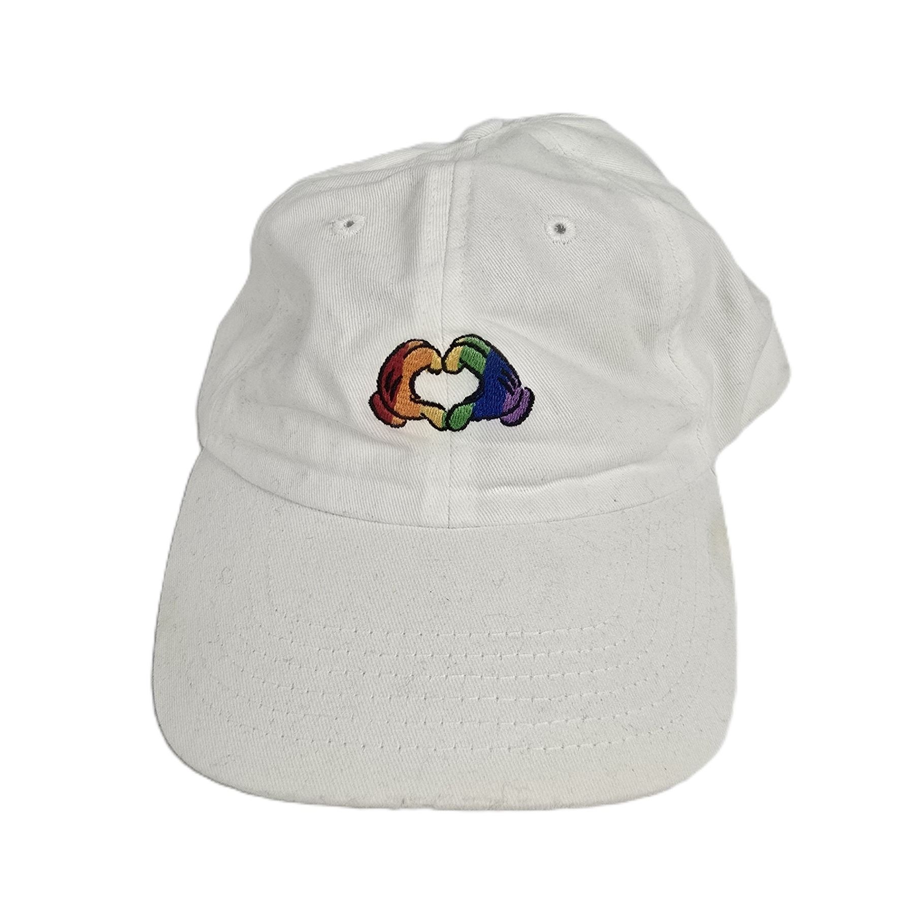(Disney) This is a white hat with rainbow Mickey hands on the front. It is used and in good condition with very light staining on the sweatband. It is one size fits most and weighs 2 oz.