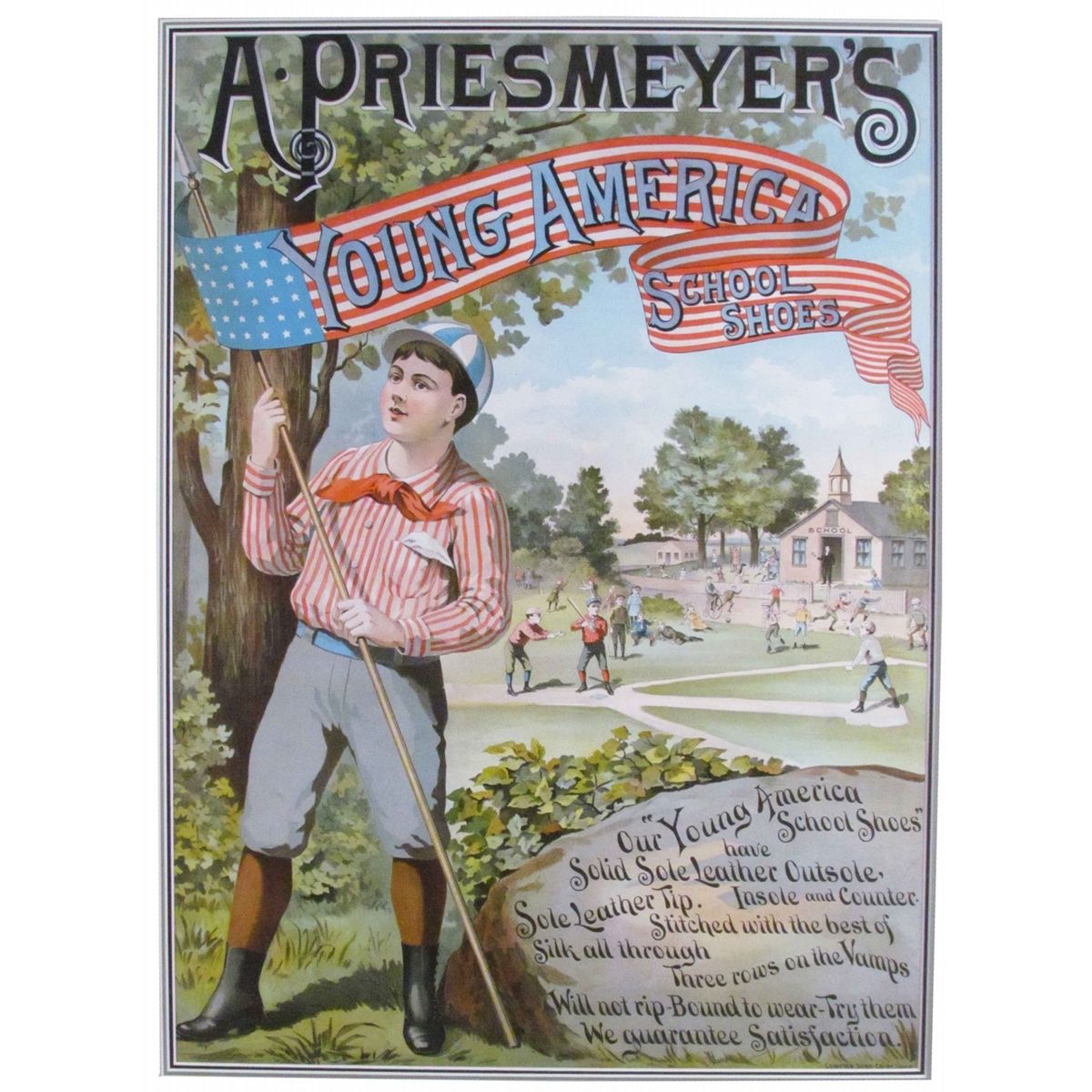 A. Priesmeyer's Young American School Shoes Paper Sign. Compton Sons Co. St. Louis. Beautiful colors with Americana graphics. Excellent condition. Framed under glass. 17 X 24 inches image only.