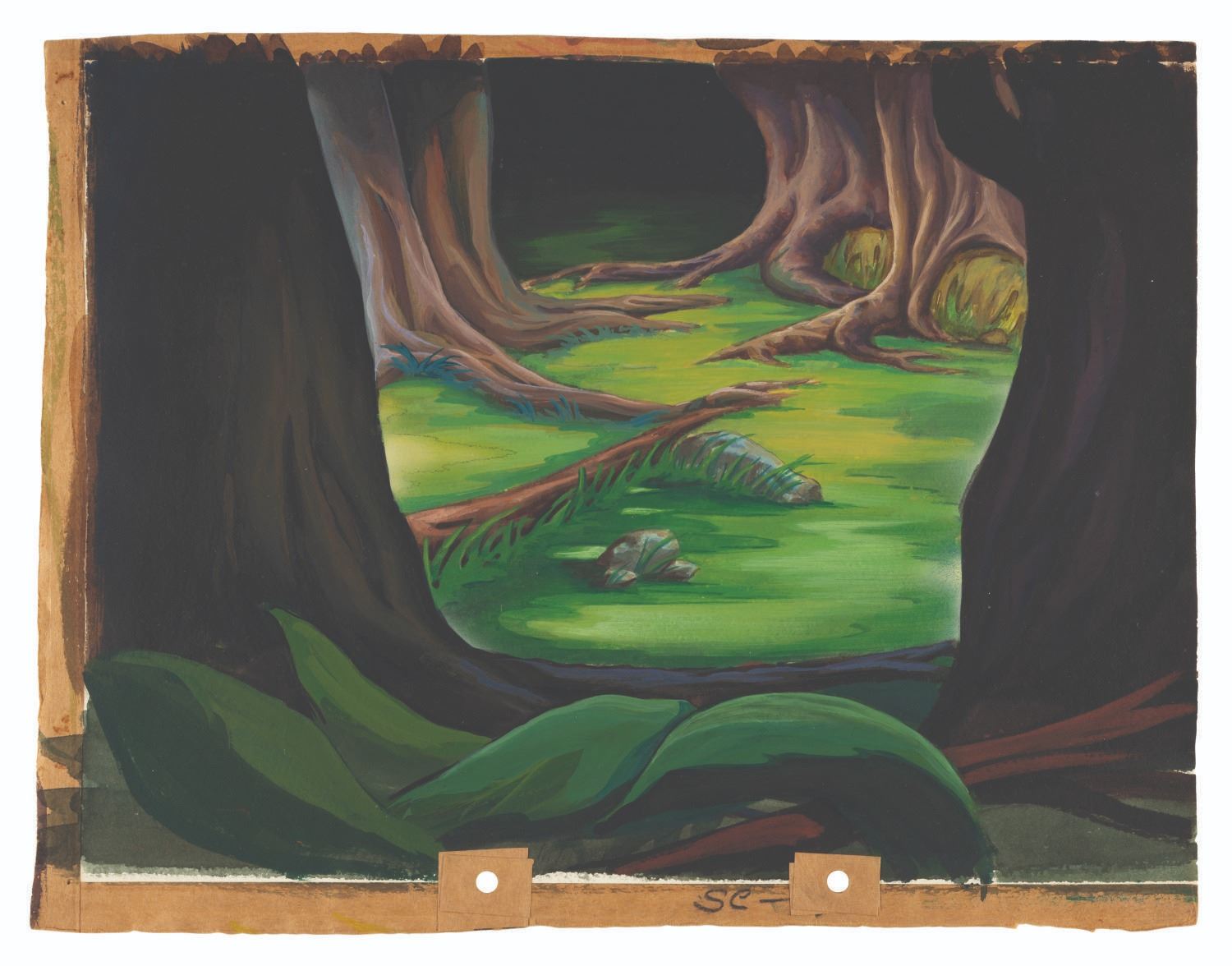 (Schlesinger, 1941) An original hand-painted production background of a forest from the Merrie Melodies short “Farm Frolics.” Accomplished in gouache on an illustration board measuring 10.25” x 13.25”, the art is in very good condition with spots of paint loss, pinholes from production use, and light wear.