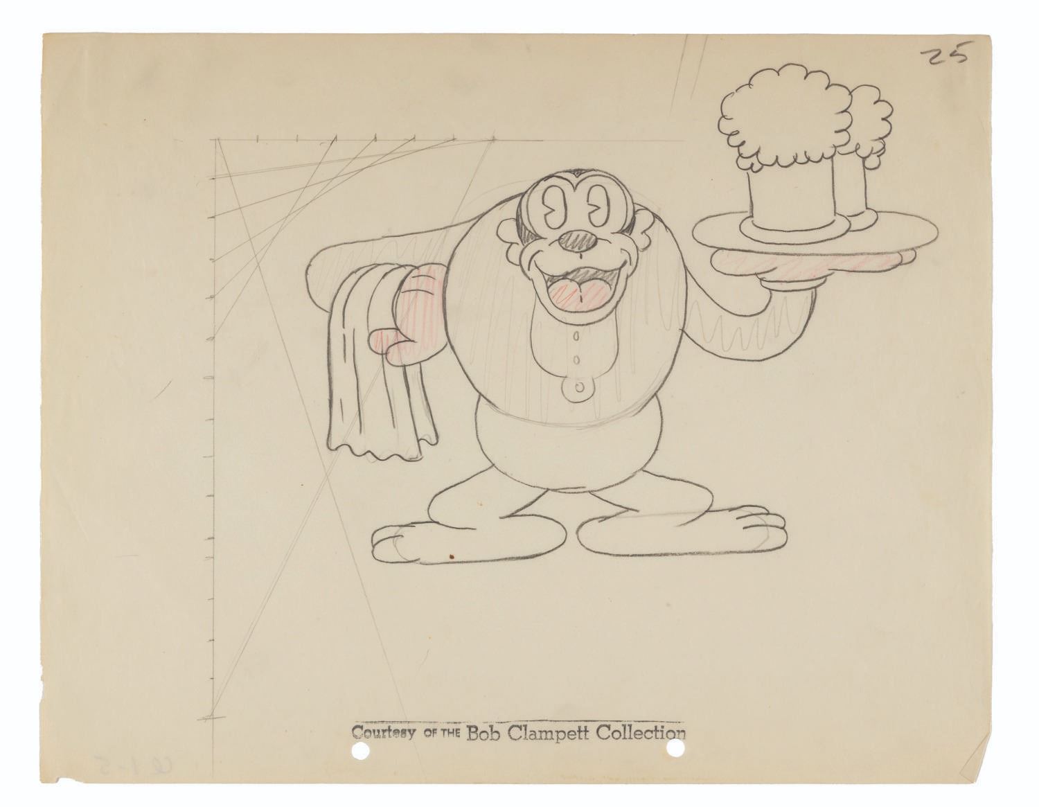 (Harman-Ising, 1931) An original production drawing of a gorilla waiter from “Lady, Play Your Mandolin,” the first film in the Merrie Melodies series. With an image size of 6” x 8.25” on 9.5” x 12” animation paper, the graphite and colored pencil drawing displays in very good condition, stamped “Courtesy of the Bob Clampett Collection,” with creases and edge wear, including tears at the bottom left corner and a fold at the bottom right.