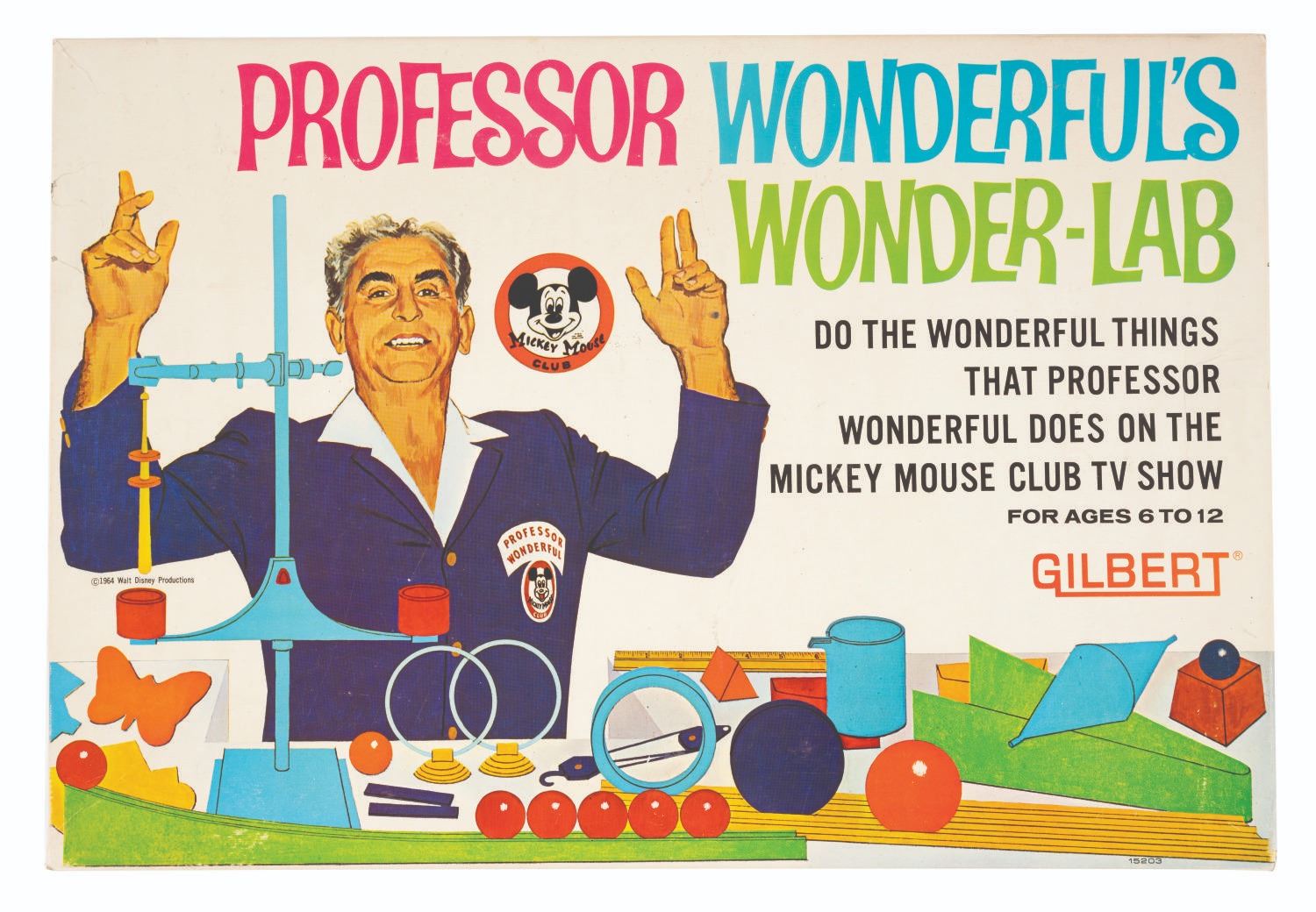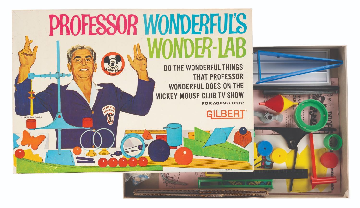 (Gilbert, 1964) A complete Professor Wonderful's Wonder Lab playset with pieces to perform experiments in physics, magnetism, and more. Professor Wonderful segments were filmed at Disneyland and added to Mickey Mouse Club episodes in syndication in the 1960s. The set is in very good condition with light wear to the parts and the 20.5” x 14” x 2.5” tall box.