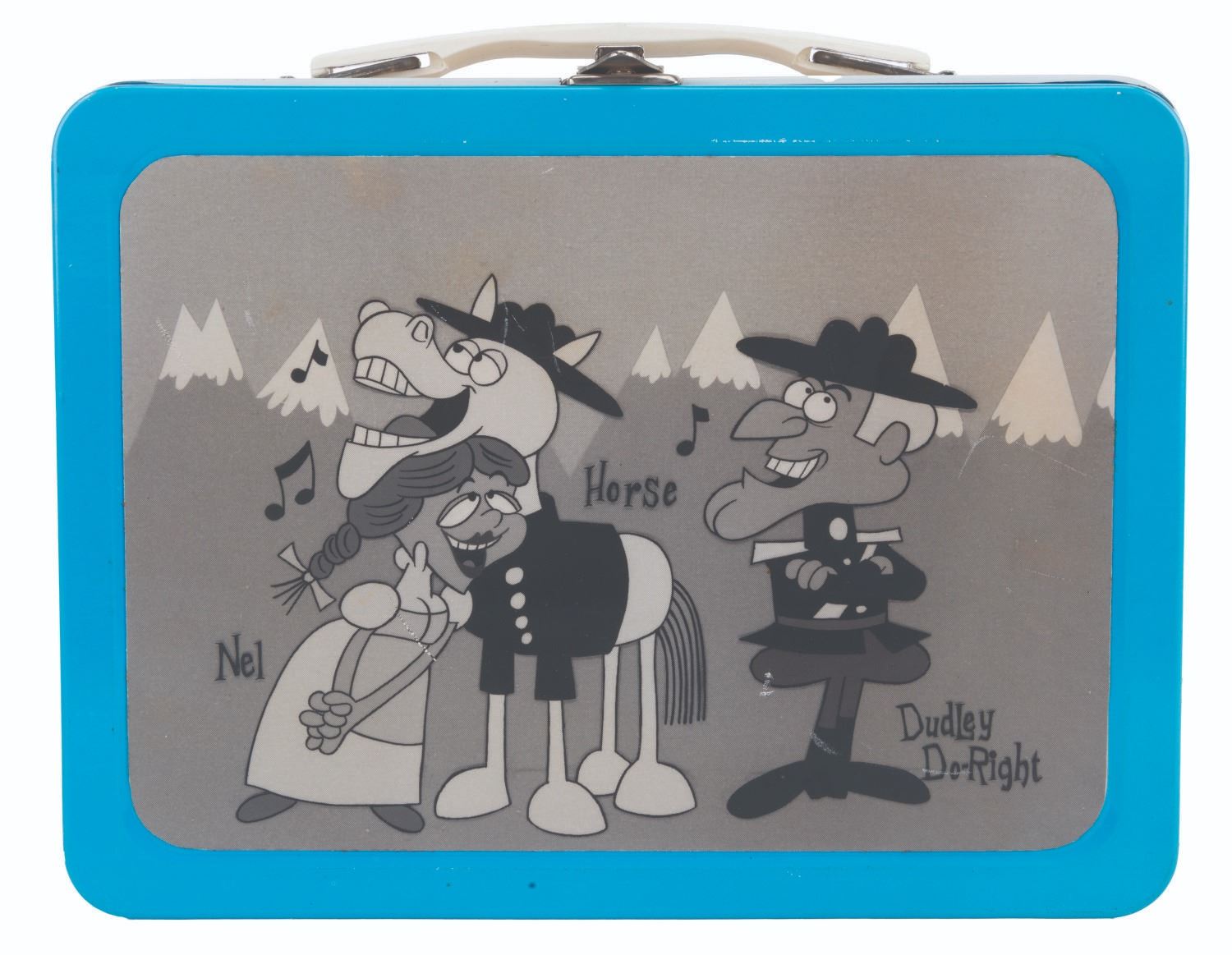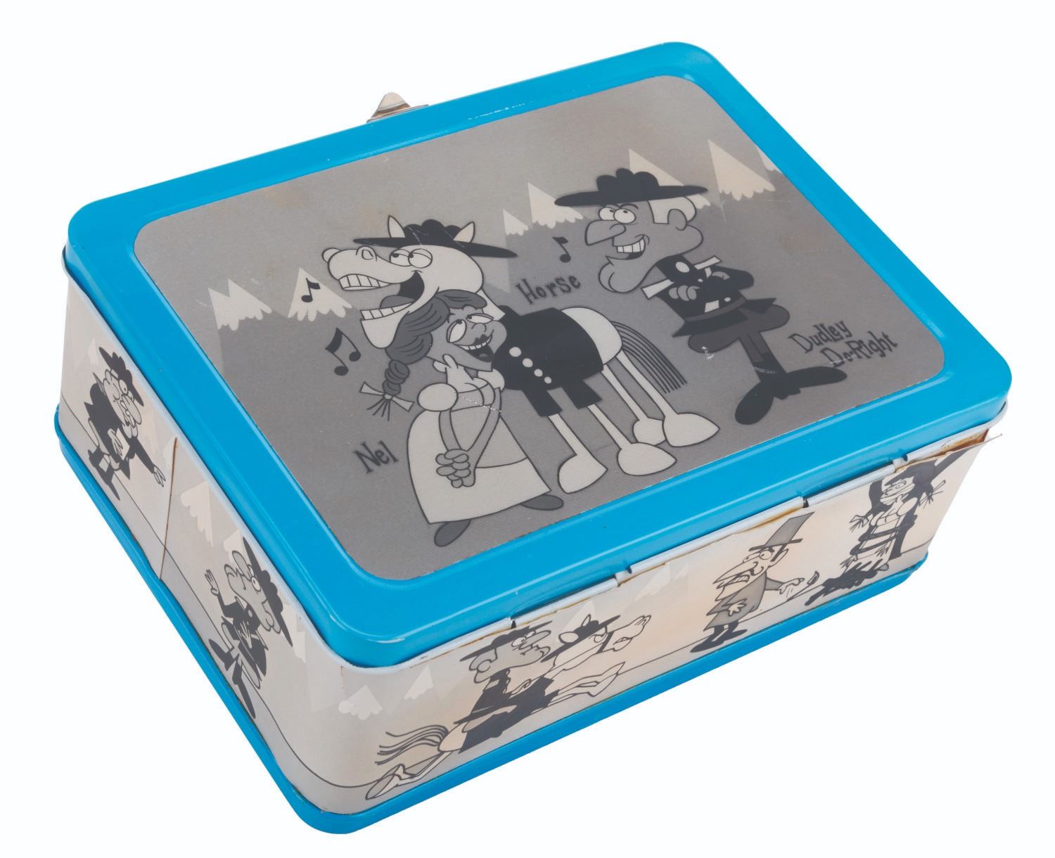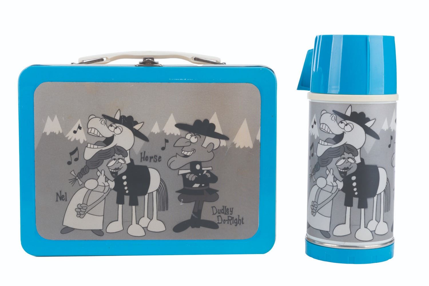(Universal, 1960s-70s) A “Dudley Do-Right” prototype Thermos and lunchbox manufactured by Universal Vacuum Products. The Thermos features a wrap-around photostat of the show's main characters, while the lunch box has the same photostat on all but one side. This design was produced in color, with the finished products now valuable collectibles. Measuring 8” tall and 3” in diameter and 9” x 3.5” and 7” tall, the Thermos and lunchbox both display in very good condition with light scratches, scuffs, peeling, and wear from production use.