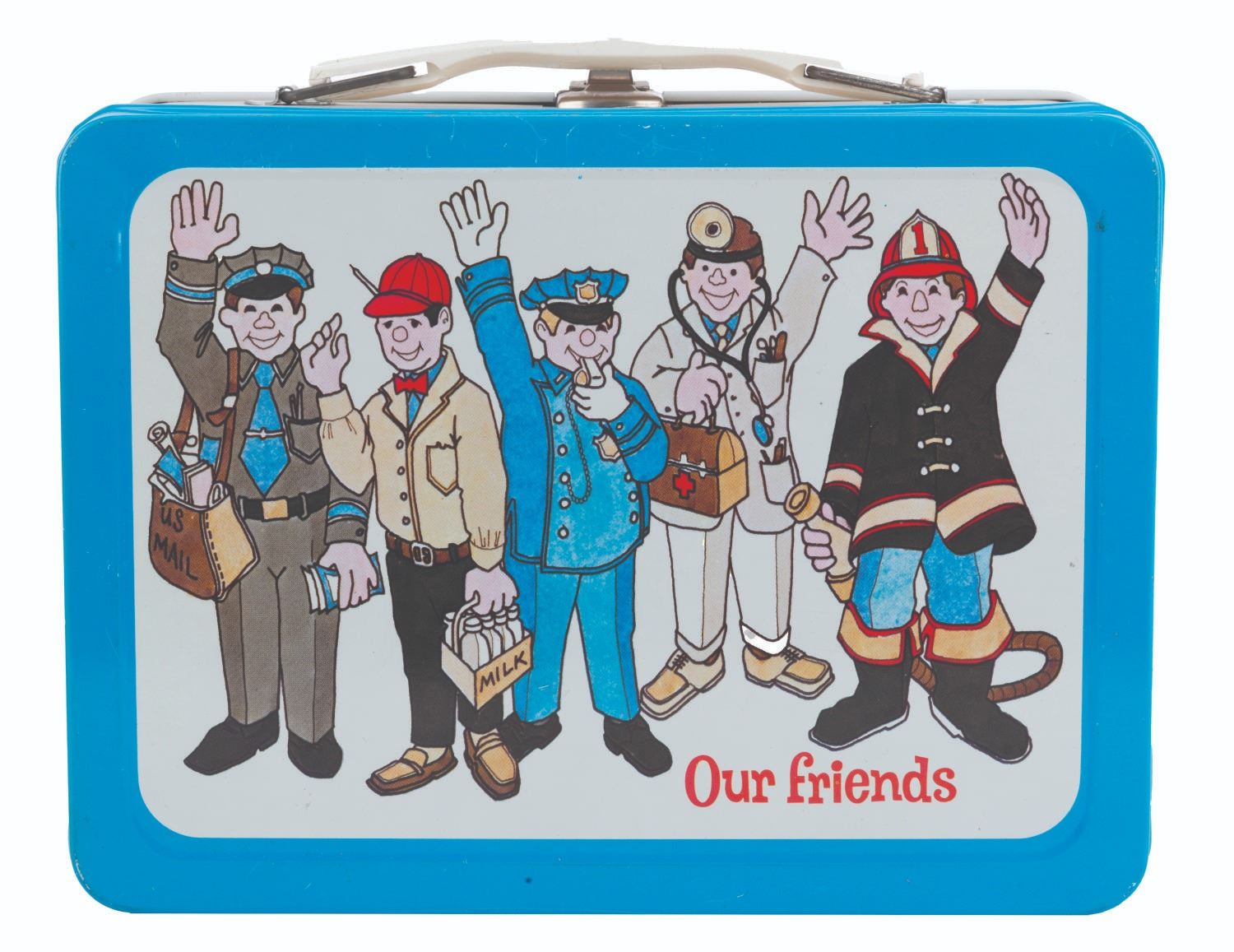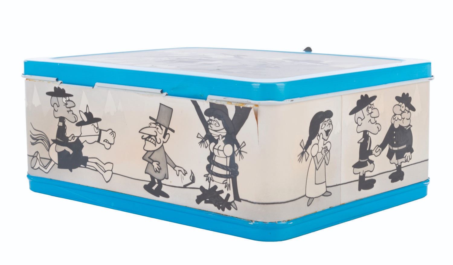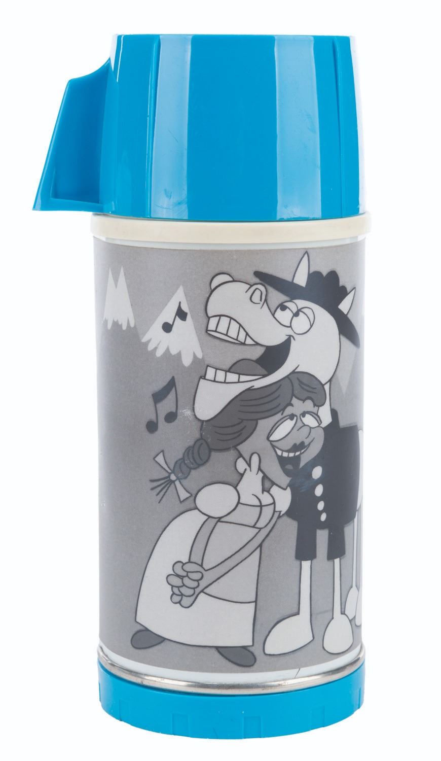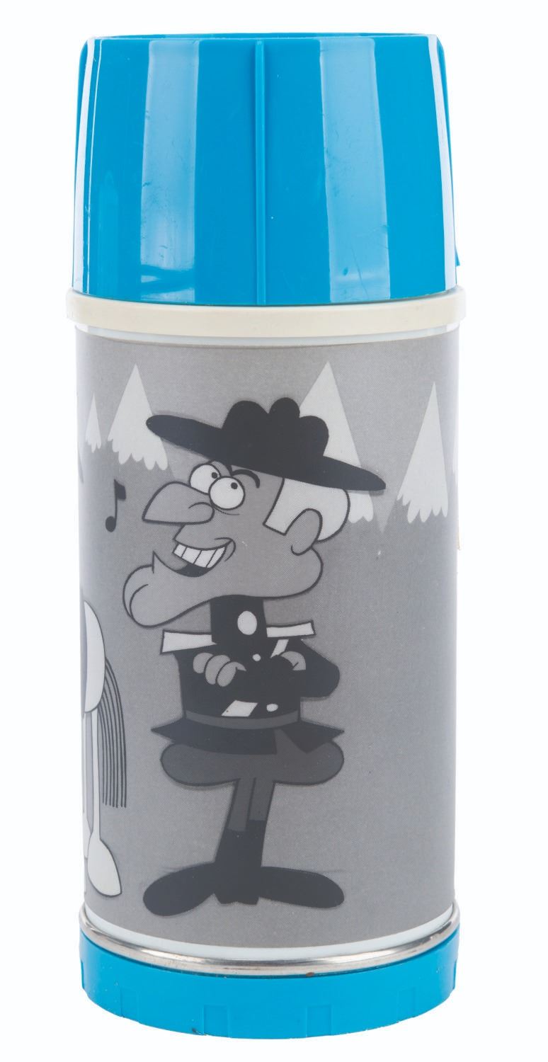 (Universal, 1960s-70s) A “Dudley Do-Right” prototype Thermos and lunchbox manufactured by Universal Vacuum Products. The Thermos features a wrap-around photostat of the show's main characters, while the lunch box has the same photostat on all but one side. This design was produced in color, with the finished products now valuable collectibles. Measuring 8” tall and 3” in diameter and 9” x 3.5” and 7” tall, the Thermos and lunchbox both display in very good condition with light scratches, scuffs, peeling, and wear from production use.