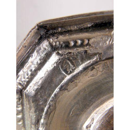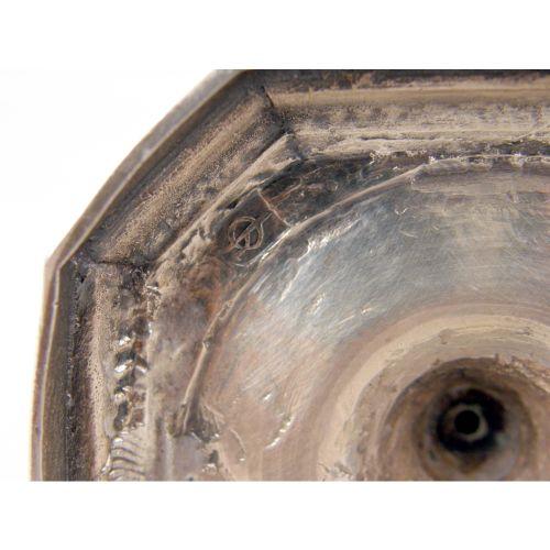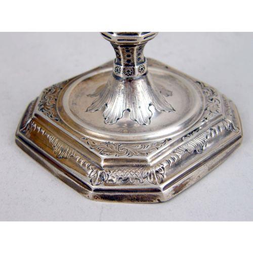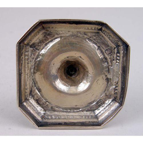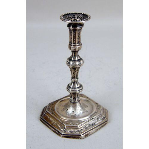 A QUEEN ANNE BRITANNIA STANDARD SILVER TAPERSTICK<BR><BR>Hallmarked, Matthew Cooper, London, 1711, all-over acanthus, and stylized floral engraved decoration, beaded border, baluster form on hexagonal base, 4-3/4"h, weight apx. 4 T.O. Provenance: Parke-Bernet #3395, June 28, 1972