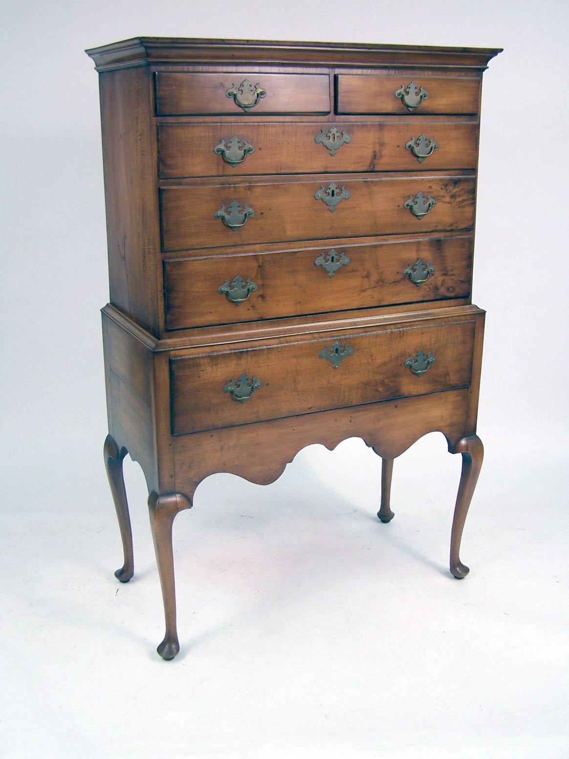 A QUEEN ANNE FIGURED MAPLE HIGH CHEST OF DRAWERS