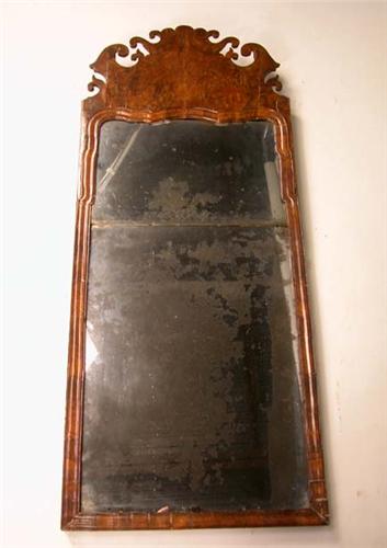 A QUEEN ANNE FIGURED WALNUT LOOKING GLASS; English, with an elaborately scrolling crest above a two-part plate and molded frame, 42"H x 18"W (minor repairs)