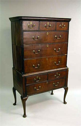 A QUEEN ANNE INLAID WALNUT HIGH CHEST OF DRAWERS; English, restored, losses, patches, and repairs 5'5 1/2"h x 37"w x 20"d