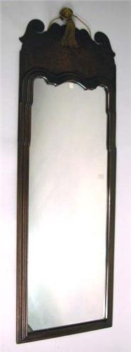 A QUEEN ANNE STYLE BURLED WALNUT LOOKING GLASS; The shaped crest surmounting a molded slip centering a mirror plate 4'h x 16"w