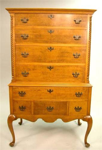 A QUEEN ANNE STYLE FIGURED MAPLE FLAT-TOP HIGH CHEST OF DRAWERS; In the New England tradition 5'2"h x 36"w x 20"d