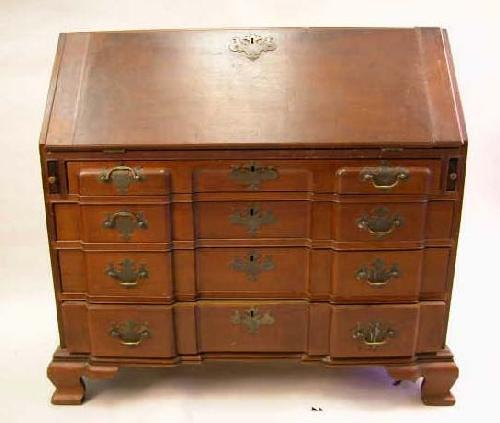 A QUEEN ANNE STYLE MAHOGANY BLOCK FRONT DESK; 39"h x 40 1/2"w x 19"d, losses