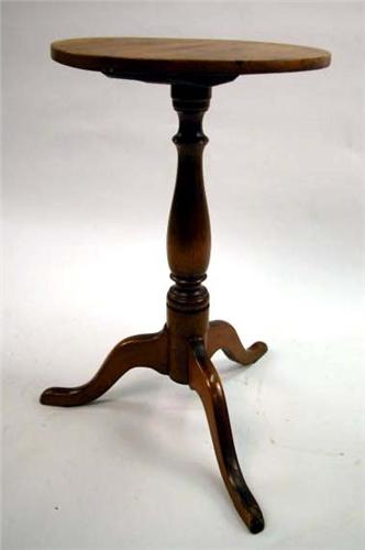 A QUEEN ANNE TURNED MAPLE AND BIRCHWOOD CANDLESTAND; New England, the circular top above a vasiform standard and ending on downswept cabriole legs, (wear throughout and top re-set) 25"h x 15 1/2" diameter