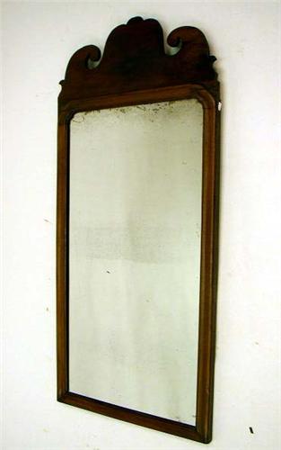 A QUEEN ANNE WALNUT LOOKING GLASS; English, with shaped crest and molded frame, repairs, 29 1/4"h x 13 3/4"w