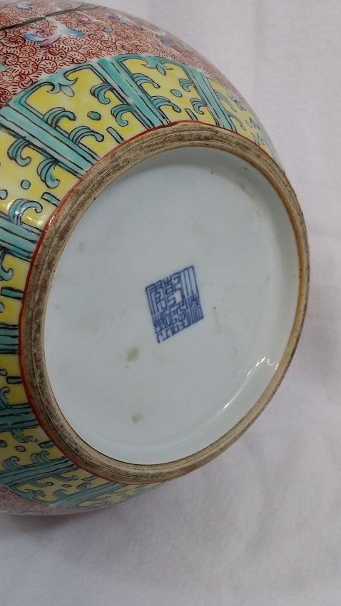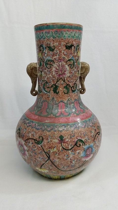 A large porcelain vase of unique bottle form with elephant head lobed trunk handles, the full body covered with hand painted enamel in fencai floral motifs and decorations of emblems with banded design. Qing dynasty, Qianlong reign blue 6 character mark at the white base. H17"xD10"