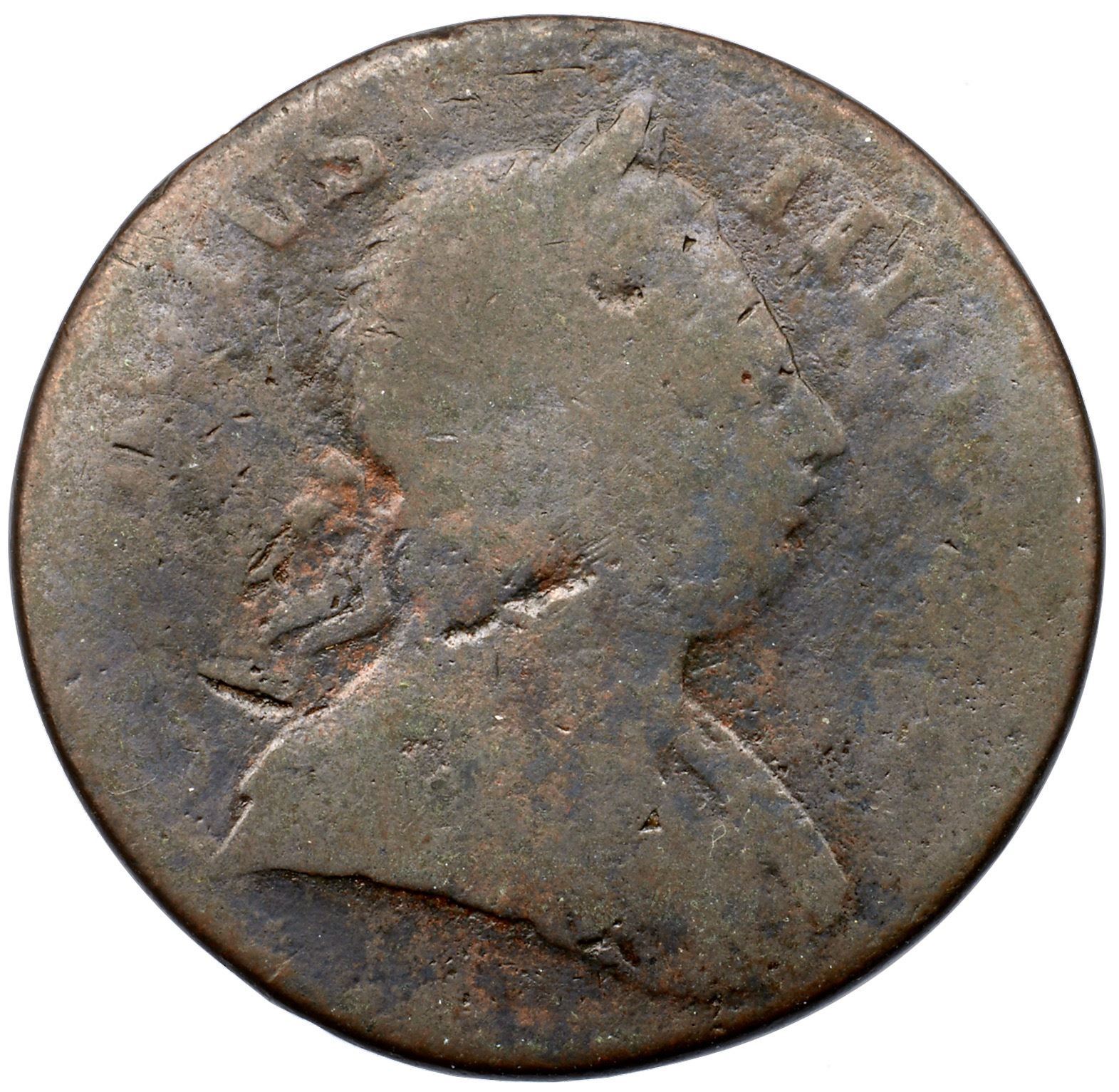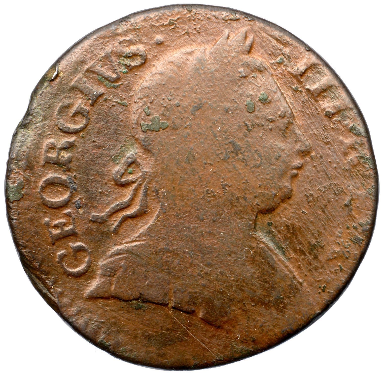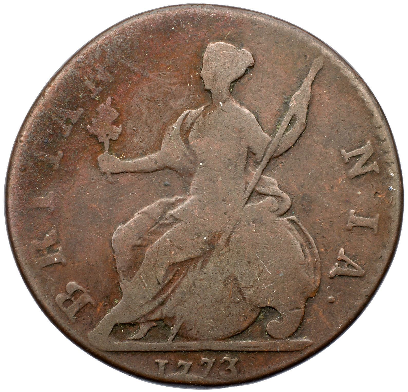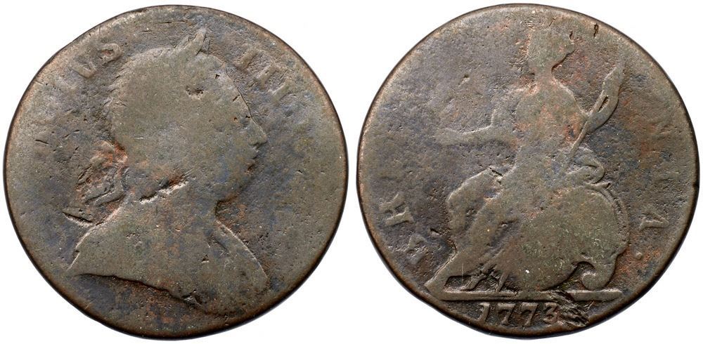 A Quartet of 1773-dated George III British Halfpence.Two definite regal pieces, purchased as counterfeit, understandable as die work was occasionally crude for regal issues of this year. and two coins that may be counterfeits but need further research. Included are: 1) Regal, Good, very worn, about half the legends visible (138.6 grains). 2) Regal, VG/Fine, lightly rough at the lower left obverse but good detail (146.2 grains). 3) Possible counterfeit, Fine, legends look a bit off to be regal, though fabric is good, light olive with some staining and verdigris on reverse (136.8 grains). 4) Possible counterfeit, VG, dark and rough, likely a grounder, off-center slightly to 3:00, style not quite up to regal quality, lighter weight (105.0 grains). Four coins in the lot.