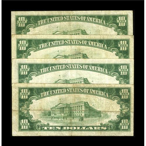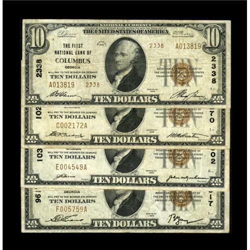 <B>A Quartet of Peach State 1929 Nationals</B></I><BR>Atlanta, GA - $10 1929 Ty. 1 Fulton NB Ch. #9617 <B>VF</B></I><BR>Columbus, GA - $10 1929 Ty. 2 First NB Ch. # 2338 <B>VF</B></I><BR>Macon, GA - $10 1929 Ty. 1 First NB & TC Ch. # 10270 <B>VF</B></I><BR>Rome, GA - $10 1929 Ty. 1 National City Bank Ch. # 10302 <B>VF</B></I>.<BR><BR><BR><b>Shipping:</b> Coin/Currency (<a target="_blank" href="http://www.heritageauctions.com/common/shipping.php">view shipping information</a>)