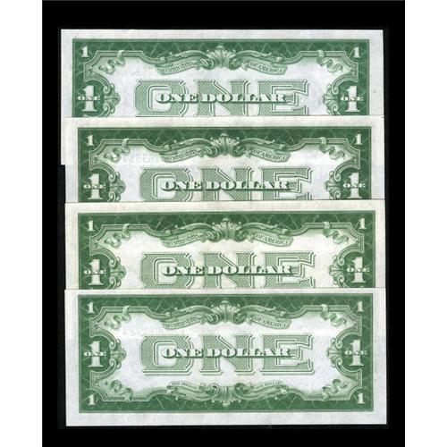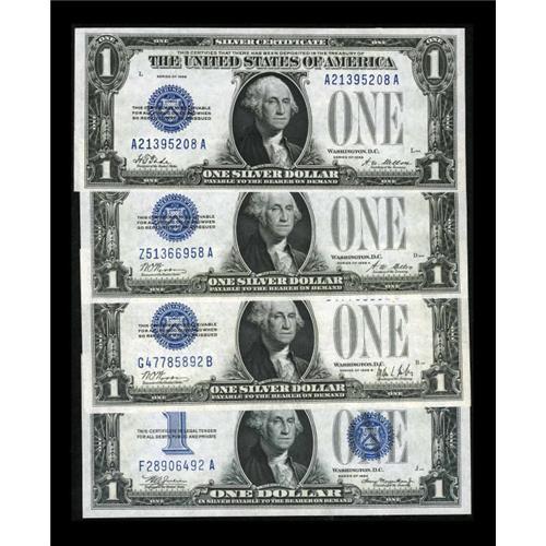 <B>A Quartet of Early $1 Silver Certificates. Choice Crisp Uncirculated or Better.</B></I><BR> Four series are represented in high quality group of $1 Silvers. They include a 1928, a 1928A, a 1928B, and a 1934. These are all pack fresh beauties with solid embossing. <BR><I>From The Thomas M. Flynn Collection</B></I><BR><BR><b>Shipping:</b> Coins & Currency (<a target="_blank" href="http://www.heritageauctions.com/common/shipping.php">view shipping information</a>)