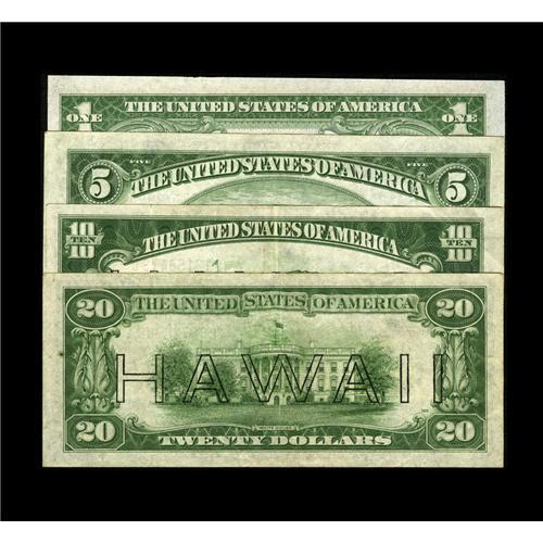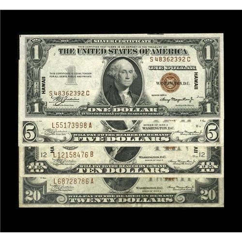 <B>A Quartette of Hawaii Emergency Notes</B></I><BR>Fr. 2300 $1 1935A Hawaii Silver Certificate Choice CU<BR>Fr. 2302 $5 1934A Hawaii Federal Reserve Note EF<BR>Fr. 2303 $10 Hawaii Federal Reserve Note VF<BR>Fr. 2305 $20 1934A Hawaii Federal Reserve Note EF.<BR><BR><BR><b>Shipping:</b> Coin/Currency (<a target="_blank" href="http://www.heritageauctions.com/common/shipping.php">view shipping information</a>)